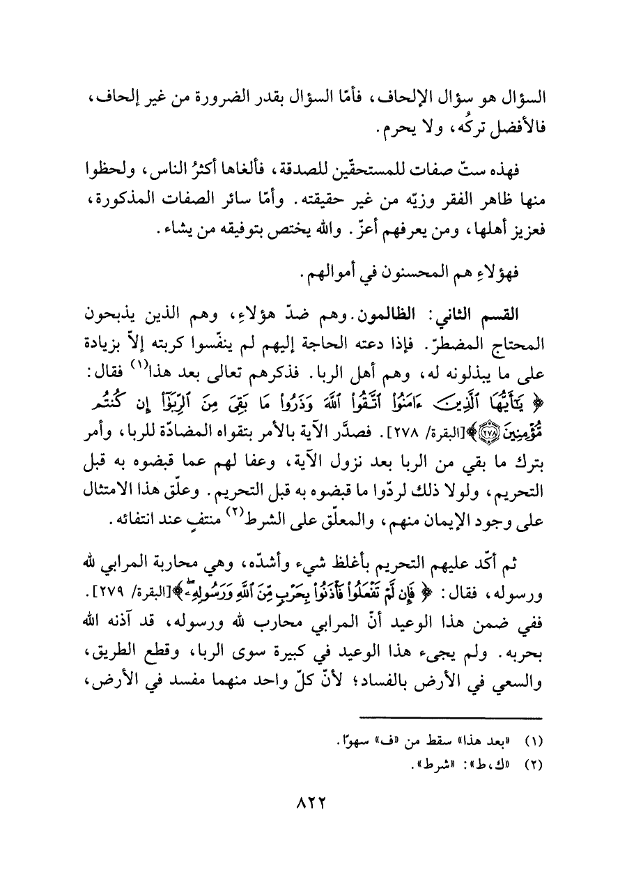 القسم الثاني: الظالمون. وهم ضدّ هؤلاءِ، وهم الذين يذبحون المحتاج المضطرّ. فإذا دعته الحاجة إليهم لم ينفّسوا كربته إلّا بزيادة على ما يبذلونه له، وهم أهل الربا. فذكرهم تعالى بعد هذا (¬١) فقال: {يَاأَيُّهَا الَّذِينَ آمَنُوا اتَّقُوا اللَّهَ وَذَرُوا مَا بَقِيَ مِنَ الرِّبَا إِنْ كُنْتُمْ مُؤْمِنِينَ (٢٧٨)} [البقرة/ ٢٧٨]. فصدَّر الآية بالأمر بتقواه المضادّة للربا، وأمر بترك ما بقي من الربا بعد نزول الآية، وعفا لهم عما قبضوه به قبل التحريم، ولولا ذلك لردّوا ما قبضوه به قبل التحريم. وعلّق هذا الامتثال على وجود الإيمان منهم، والمعلّق على الشرط (¬٢) منتفٍ عند انتفائه.