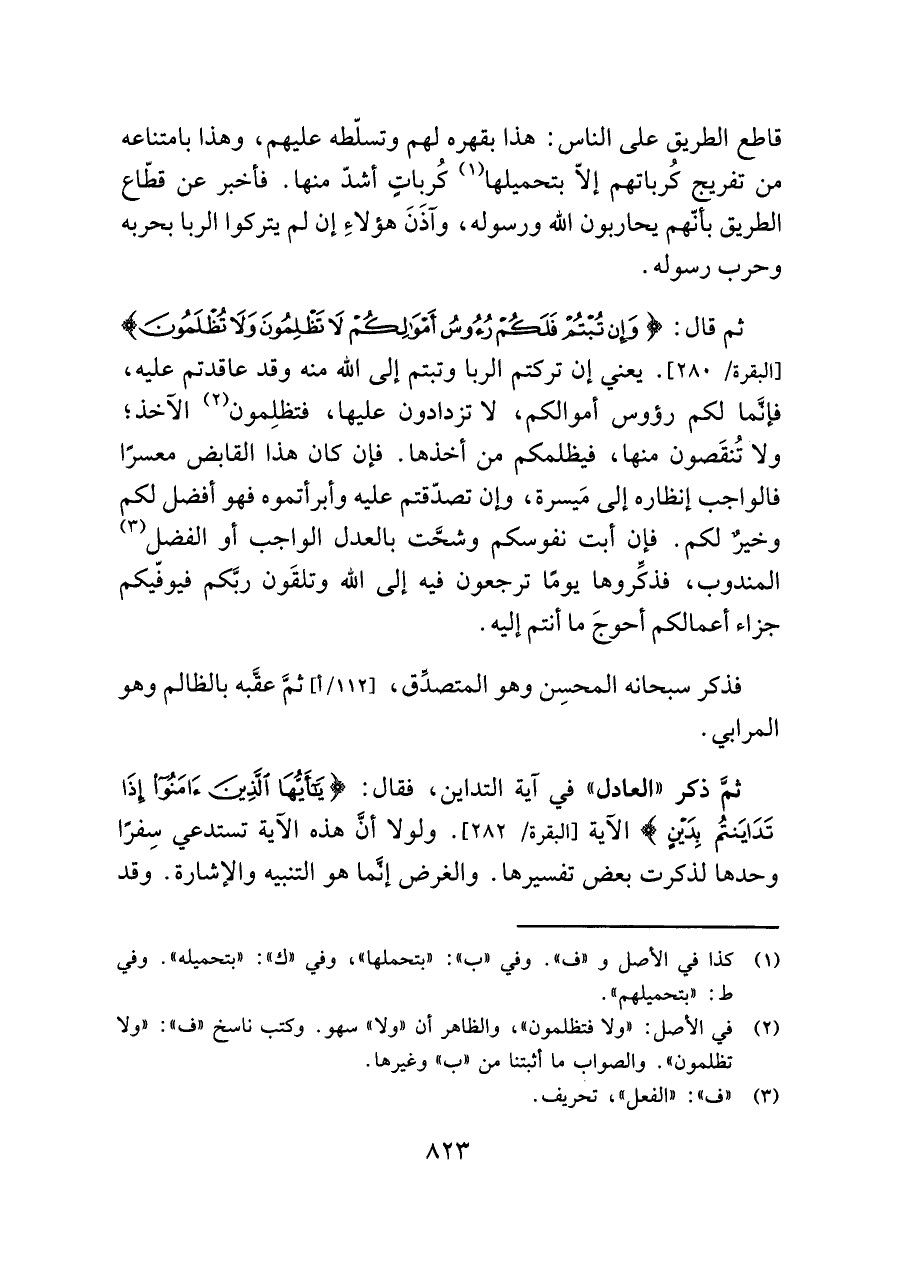 ثم قال: {وَإِنْ تُبْتُمْ فَلَكُمْ رُءُوسُ أَمْوَالِكُمْ لَا تَظْلِمُونَ وَلَا تُظْلَمُونَ} [البقرة/ ٢٨٠]. يعني إن تركتم الربا وتبتم إلى اللَّه منه وقد عاقدتم عليه، فإنَّما لكم رؤوس أموالكم، لا تزدادون عليها، فتظلِمون (¬٢) الآخذ؛ ولا تُنقَصون منها، فيظلمكم من أخذها. فإن كان هذا القابض معسرًا فالواجب إنظاره إلى مَيسرة، وإن تصدّقتم عليه وأبرأتموه فهو أفضل لكم وخير لكم. فإن أبت نفوسكم وشحَّت بالعدل الواجب أو الفضل (¬٣) المندوب، فذكّروها يومًا ترجعون فيه إلى اللَّه وتلقَون ربَّكم فيوفّيكم جزاء أعمالكم أحوجَ ما أنتم إليه.