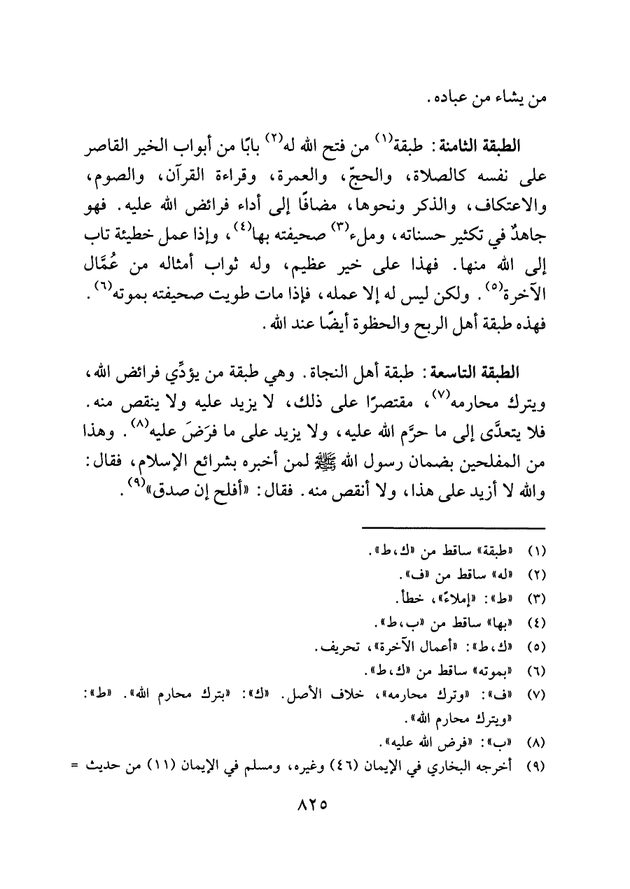 الطبقة التاسعة: طبقة أهل النجاة. وهي طبقة من يؤدِّي فرائض اللَّه، ويترك محارمه (¬٧)، مقتصرًا على ذلك، لا يزيد عليه ولا ينقص منه. فلا يتعدَّى إلى ما حرَّم اللَّه عليه، ولا يزيد على ما فرَضَ عليه (¬٨). وهذا من المفلحين بضمان رسول اللَّه -صلى اللَّه عليه وسلم- لمن أخبره بشرائع الإسلام، فقال: واللَّه لا أزيد على هذا، ولا أنقص منه. فقال: "أفلح إن صدق" (¬٩).