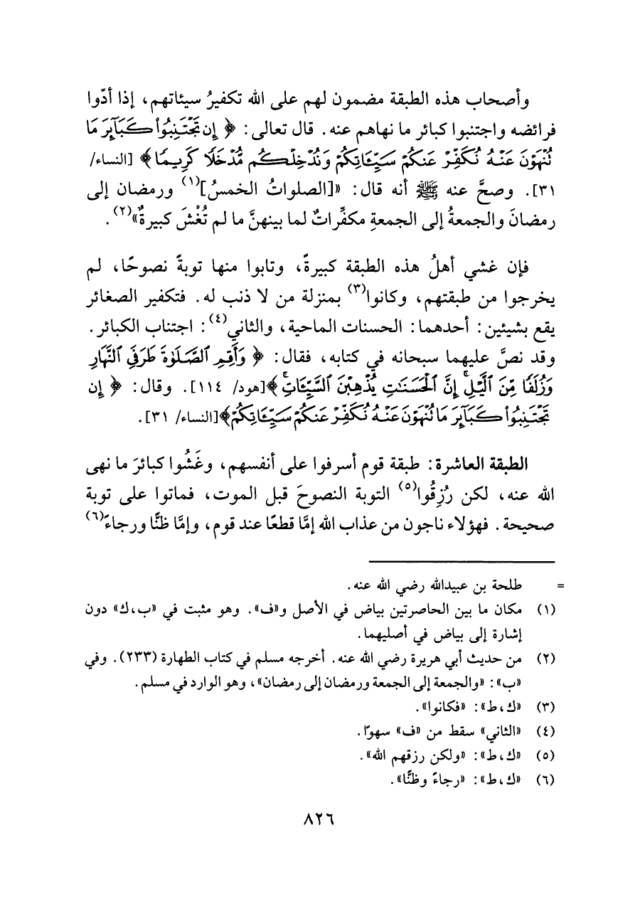 وأصحاب هذه الطبقة مضمون لهم على اللَّه تكفيرُ سيئاتهم، إذا أدّوا فرائضه واجتنبوا كبائر ما نهاهم عنه. قال تعالى: {إِنْ تَجْتَنِبُوا كَبَائِرَ مَا تُنْهَوْنَ عَنْهُ نُكَفِّرْ عَنْكُمْ سَيِّئَاتِكُمْ وَنُدْخِلْكُمْ مُدْخَلًا كَرِيمًا} [النساء/ ٣١]. وصحَّ عنه -صلى اللَّه عليه وسلم- أنه قال: " [الصلواتُ الخمسُ] (¬١) ورمضان إلى رمضانَ والجمعةُ إلى الجمعةِ مكفِّراتٌ لما بينهنَّ ما لم تُغْشَ كبيرةٌ" (¬٢).