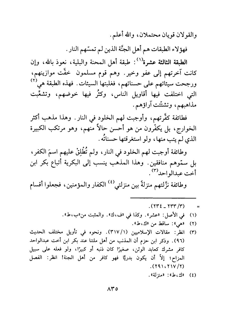 (¬٣) انظر: مقالات الإسلاميين (١/ ٣١٧). ونحوه في تأويل مختلف الحديث (٩٦). وذكر ابن حزم أن المذنب من أهل ملتنا عند بكر ابن أخت عبد الواحد كافر مشرك كعابد الوثن، صغيرًا كان ذنبه أو كبيرًا، ولو فعله على سبيل المزاح؛ إلّا أن يكون بدريًّا فهو كافر من أهل الجنة! انظر: الفصل (٢/ ٢١٧، ٢٩١).