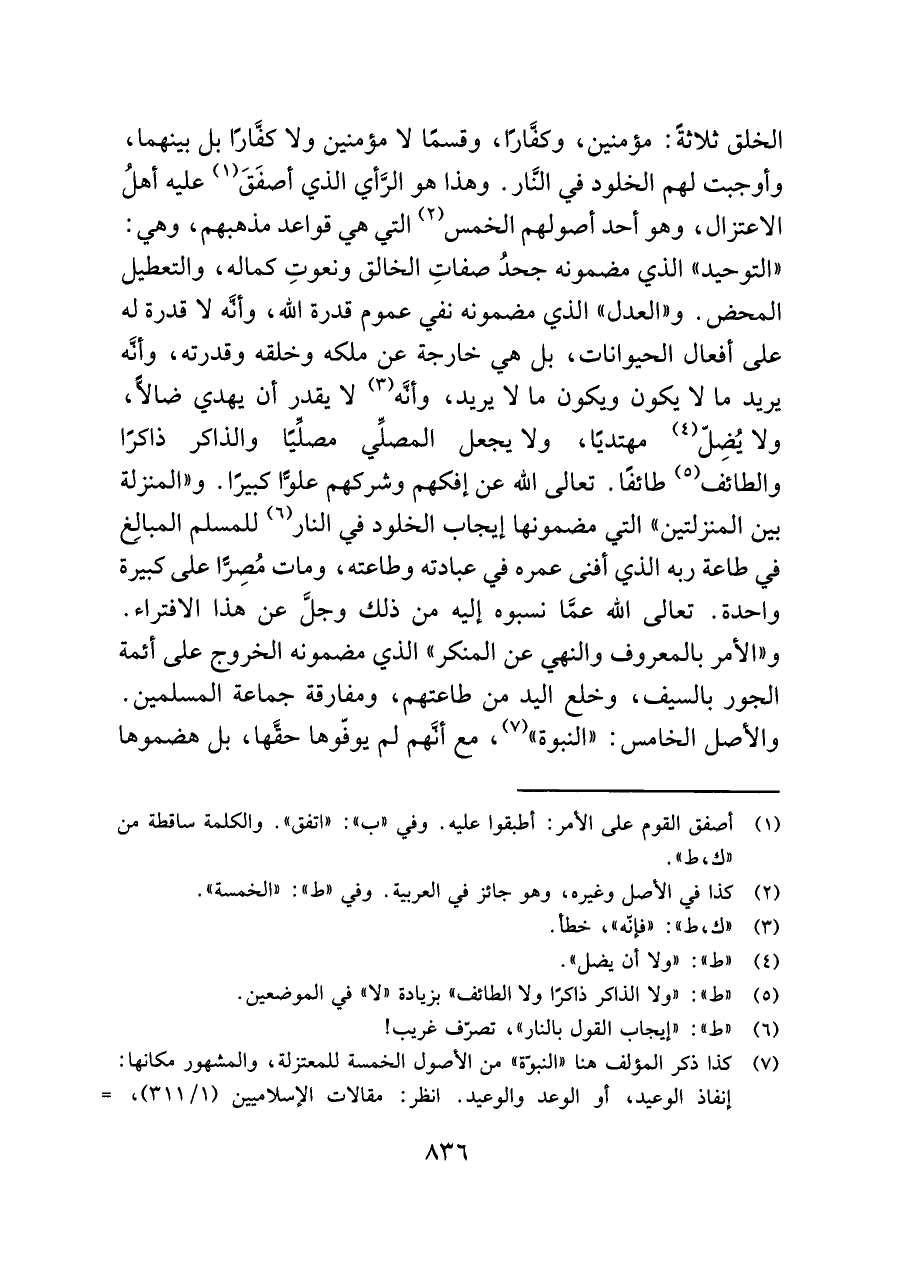 (¬٧) كذا ذكر المؤلف هنا "النبوّة" من الأصول الخمسة للمعتزلة، والمشهور مكانها: إنفاذ الوعيد، أو الوعد والوعيد. انظر: مقالات الإسلاميين (١/ ٣١١)، =