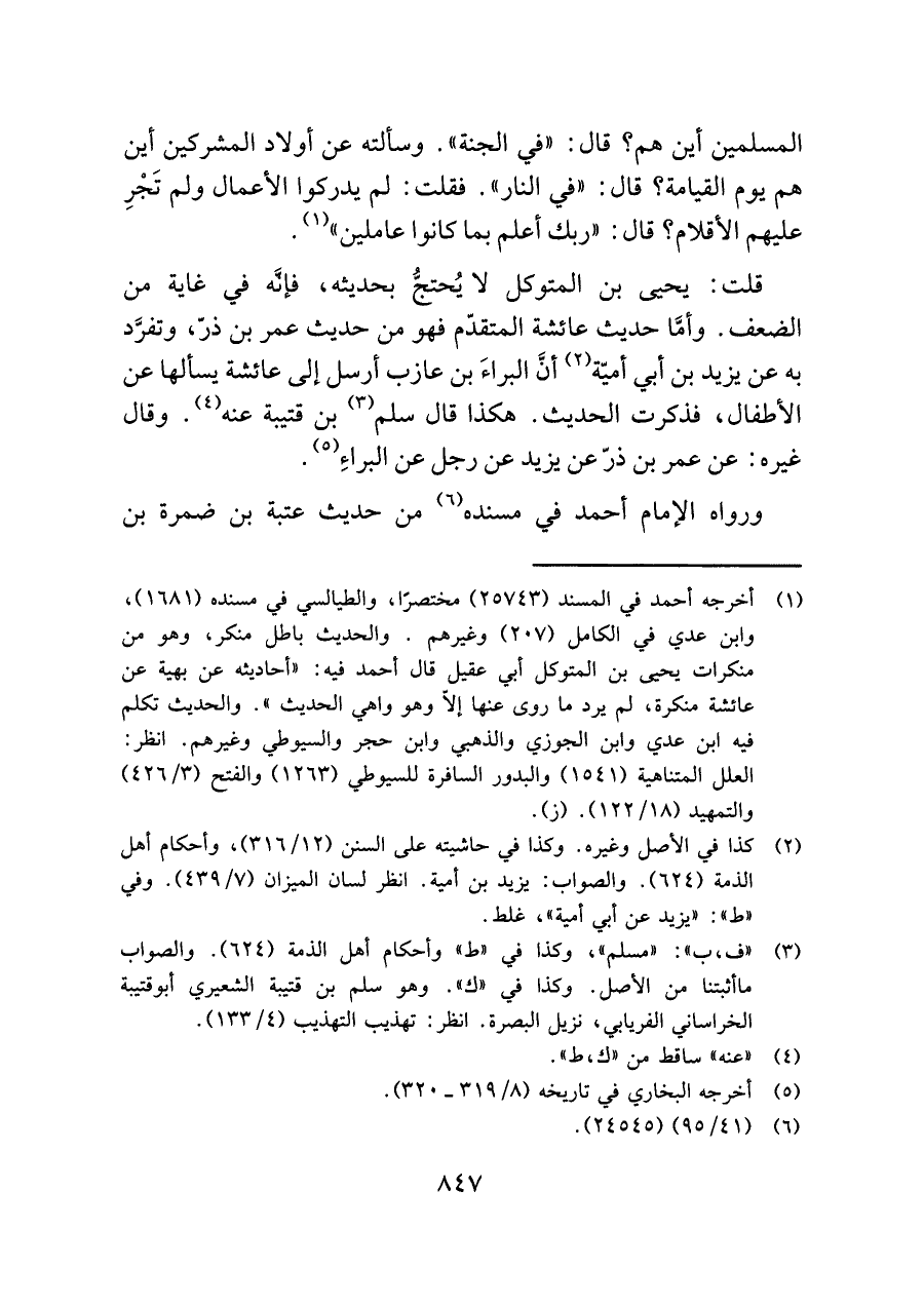 قلت: يحيى بن المتوكل لا يُحتجُّ بحديثه، فإنَّه في غاية من الضعف. وأمَّا حديث عائشة المتقدّم فهو من حديث عمر بن ذرّ، وتفرَّد به عن يزيد بن أبي أميّة (¬٢) أنَّ البراءَ بن عازب أرسل إلى عائشة يسألها عن الأطفال، فذكرت الحديث. هكذا قال سلم (¬٣) بن قتيبة عنه (¬٤). وقال غيره: عن عمر بن ذرّ عن يزيد عن رجل عن البراءِ (¬٥).