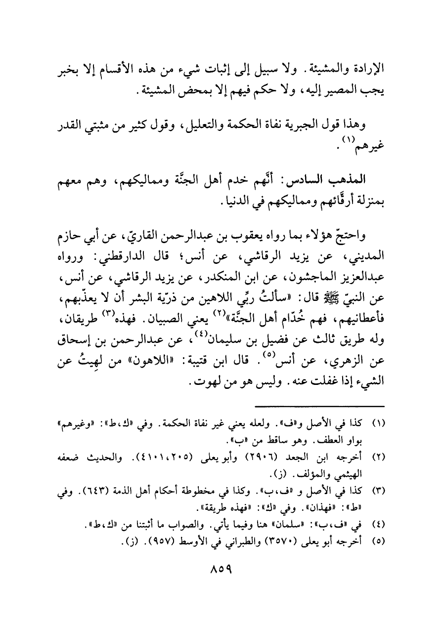 واحتجّ هؤلاء بما رواه يعقوب بن عبد الرحمن القاريّ، عن أبي حازم المديني، عن يزيد الرقاشي، عن أنس؛ قال الدارقطني: ورواه عبد العزيز الماجشون، عن ابن المنكدر، عن يزيد الرقاشي، عن أنس، عن النبيّ -صلى اللَّه عليه وسلم- قال: "سألتُ ربِّي اللاهين من ذرّية البشر أن لا يعذّبهم، فأعطانيهم، فهم خُدّام أهل الجنَّة" (¬٢) يعني الصبيان. فهذه (¬٣) طريقان، وله طريق ثالث عن فضيل بن سليمان (¬٤)، عن عبد الرحمن بن إسحاق عن الزهري، عن أنس (¬٥). قال ابن قتيبة: "اللاهون" من لهِيتُ عن الشيء إذا غفلت عنه. وليس هو من لهوت.