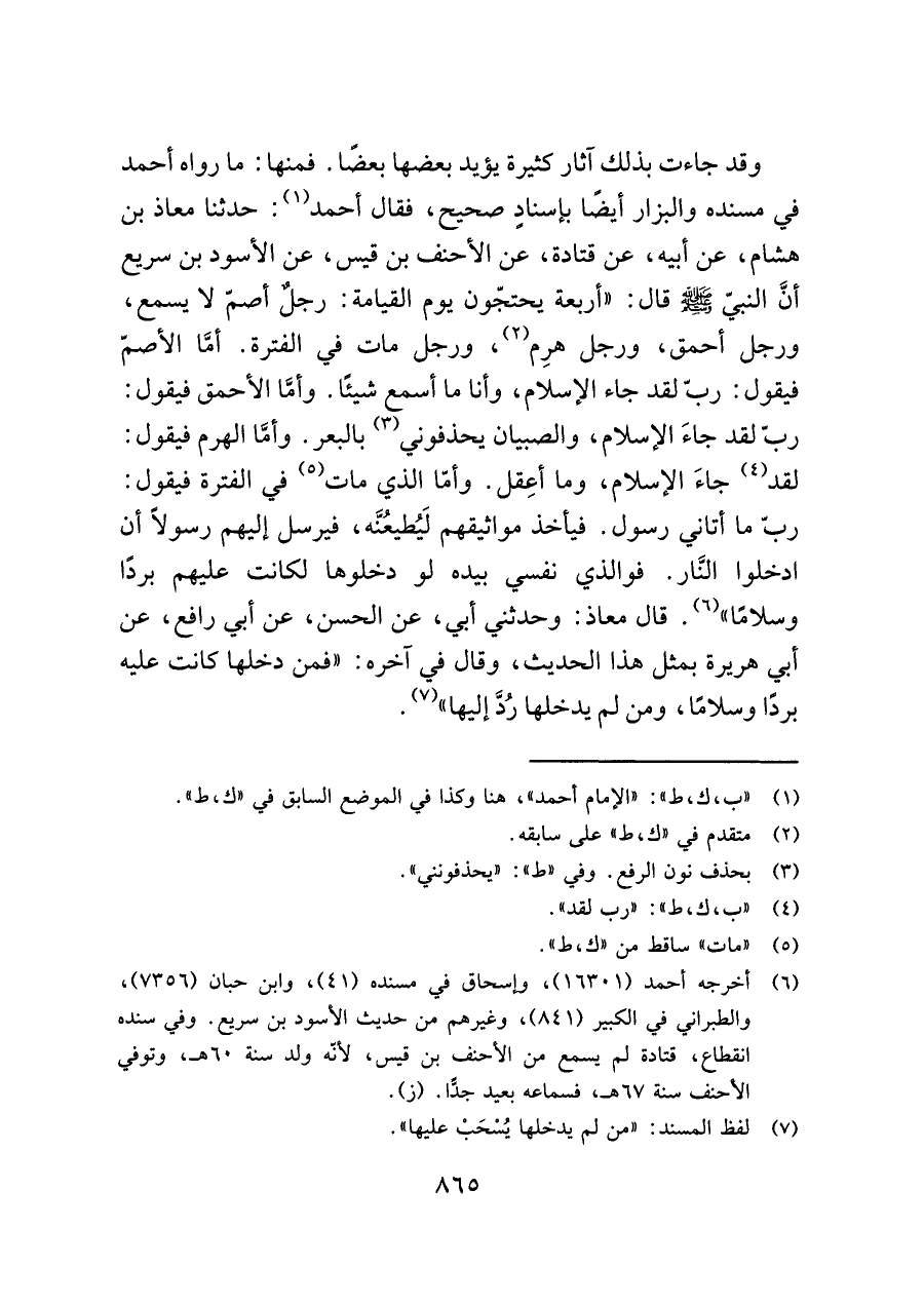 وقد جاءت بذلك آثار كثيرة يؤيد بعضها بعضًا. فمنها: ما رواه أحمد في مسنده والبزار أيضًا بإسنادٍ صحيح، فقال أحمد (¬١): حدثنا معاذ بن هشام، عن أبيه، عن قتادة، عن الأحنف بن قيس، عن الأسود بن سريع أنَّ النبيّ -صلى اللَّه عليه وسلم- قال: "أربعة يحتجّون يوم القيامة: رجلٌ أصمّ لا يسمع، ورجل أحمق، ورجل هرِم (¬٢)، ورجل مات في الفترة. أمَّا الأصمّ فيقول: ربّ لقد جاء الإسلام، وأنا ما أسمع شيئًا. وأمَّا الأحمق فيقول: ربّ لقد جاءَ الإسلام، والصبيان يحذفوني (¬٣) بالبعر. وأمَّا الهرم فيقول: لقد (¬٤) جاءَ الإسلام، وما أعِقل. وأمّا الذي مات (¬٥) في الفترة فيقول: ربِّ ما أتاني رسول. فيأخذ مواثيقهم لَيُطيعُنَّه، فيرسل إليهم رسولًا أن ادخلوا النَّار. فوالذي نفسي بيده لو دخلوها لكانت عليهم بردًا وسلامًا" (¬٦). قال معاذ: وحدثني أبي، عن الحسن، عن أبي رافع، عن أبي هريرة بمثل هذا الحديث، وقال في آخره: "فمن دخلها كانت عليه بردًا وسلامًا، ومن لم يدخلها رُدَّ إليها" (¬٧).