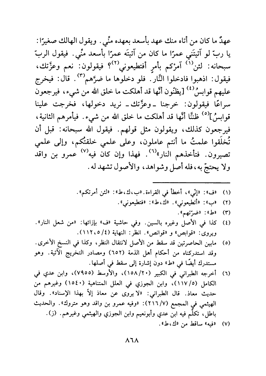 عهدٌ ما كان من أتاه منك عهد بأسعد بعهده منِّي. ويقول الهالك صغيرًا: يا ربِّ لو آتيتَني عمرًا ما كان من آتيتَه عمرًا بأسعد منِّي. فيقول الربّ سبحانه: لئن (¬١) آمرْكم بأمرٍ أفتطيعوني (¬٢)؟ فيقولون: نعم وعزَّتك، فيقول: اذهبوا فادخلوا النَّار. فلو دخلوها ما ضرَّهم (¬٣). قال: فيخرج عليهم قوابسُ (¬٤) [يظنّون أنَّها قد أهلكت ما خلق اللَّه من شيء، فيرجعون سراعًا فيقولون: خرجنا -وعزَّتك- نريد دخولها، فخرجت علينا قوابسُ، (¬٥) ظننَّا أنَّها قد أهلكت ما خلق اللَّه من شيء. فيأمرهم الثانية، فيرجعون كذلك، ويقولون مثل قولهم. فيقول اللَّه سبحانه: قبل أن تُخلَقوا علمتُ ما أنتم عاملون، وعلى علمي خلقتُكم، وإلى علمي تصيرون. فتأخذهم النار" (¬٦). فهذا وإن كان فيه (¬٧) عمرو بن واقد ولا يحتجّ به، فله أصل وشواهد، والأصول تشهد له.