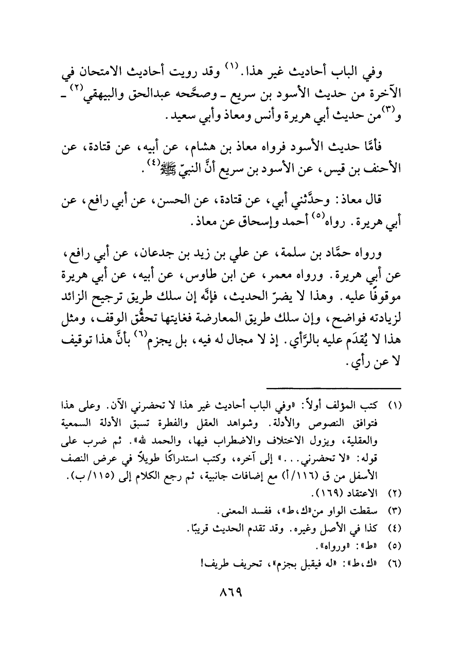 (¬١) كتب المؤلف أولًا: "وفي الباب أحاديث غير هذا لا تحضرني الآن. وعلى هذا فتوافق النصوص والأدلة. وشواهد العقل والفطرة تسبق الأدلة السمعية والعقلية، ويزول الاختلاف والاضطراب فيها، والحمد للَّه". ثم ضرب على قوله: "لا تحضرني. . . " إلى آخره، وكتب استدراكًا طويلًا في عرض النصف الأسفل من ق (١١٦/ أ) مع إضافات جانبية، ثم رجع الكلام إلى (١١٥/ ب).