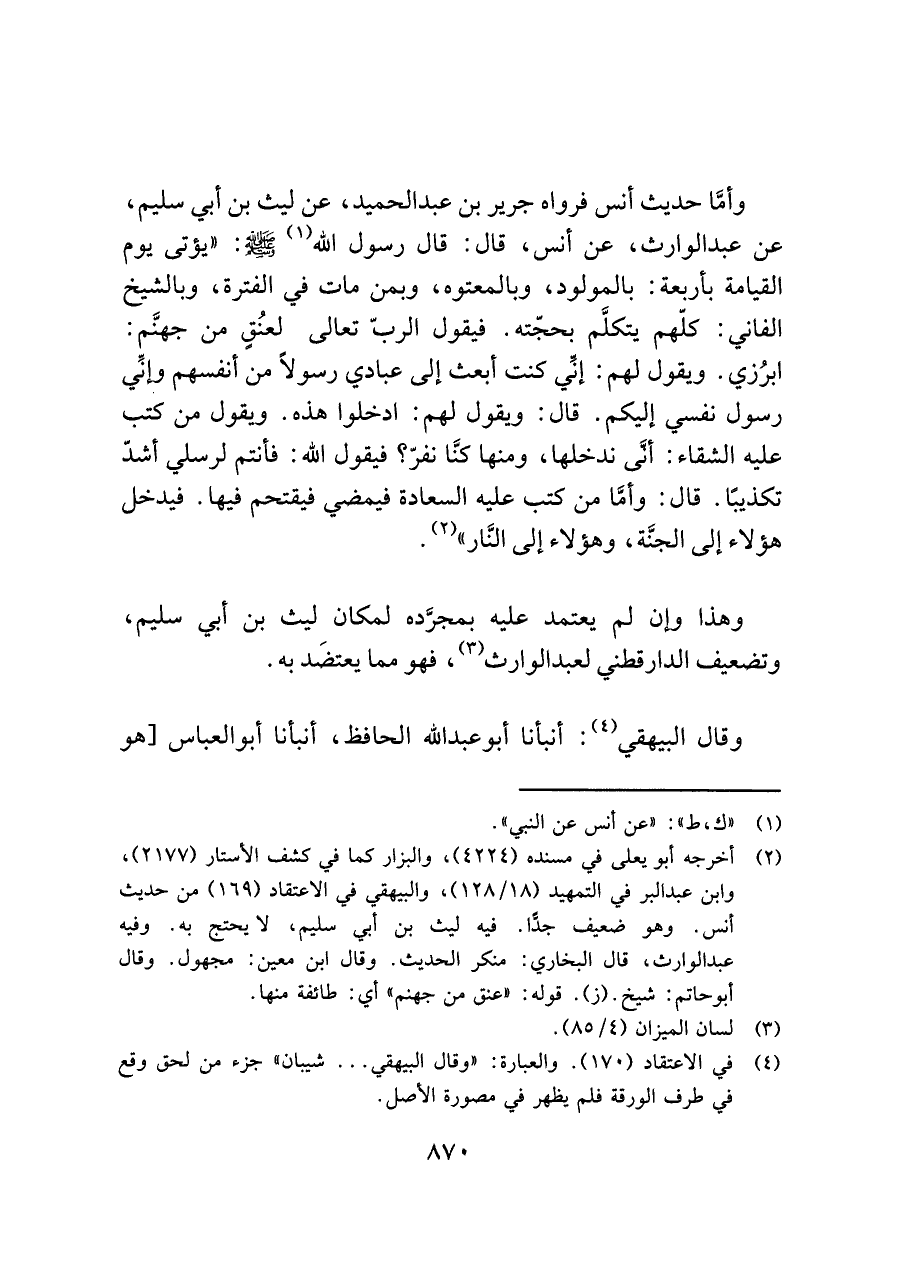 وأمَّا حديث أَنس فرواه جرير بن عبد الحميد، عن ليث بن أبي سليم، عن عبد الوارث، عن أَنس، قال: قال رسول اللَّه (¬١) -صلى اللَّه عليه وسلم-: "يؤتى يوم القيامة بأربعة: بالمولود، وبالمعتوه، وبمن مات في الفترة، وبالشيخ الفاني: كلّهم يتكلَّم بحجّته. فيقول الربّ تعالى لعنُقٍ من جهنَّم: ابرُزي. ويقول لهم: إنِّي كنت أبعث إلى عبادي رسولًا من أنفسهم وإنِّي رسول نفسي إليكم. قال: ويقول لهم: ادخلوا هذه. ويقول من كتب عليه الشقاء: أنَّى ندخلها، ومنها كنَّا نفرّ؟ فيقول اللَّه: فأنتم لرسلي أشدّ تكذيبًا. قال: وأمَّا من كتب عليه السعادة فيمضي فيقتحم فيها. فيدخل هؤلاء إلى الجنَّة، وهؤلاء إلى النَّار" (¬٢).