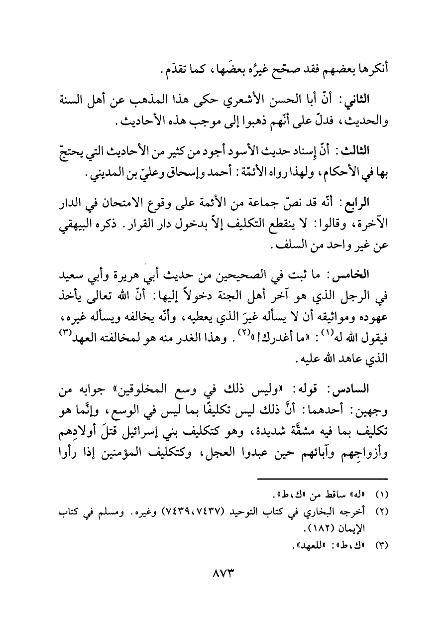 الرابع: أنّه قد نصّ جماعة من الأئمة على وقوع الامتحان في الدار الآخرة، وقالوا: لا ينقطع التكليف إلَّا بدخول دار القرار. ذكره البيهقي عن غير واحد من السلف.