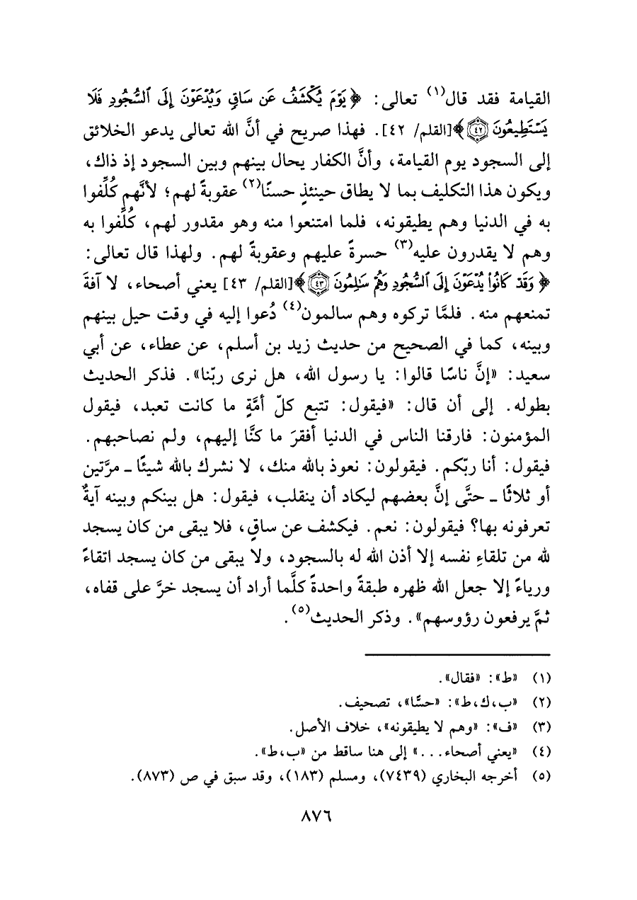 القيامة فقد قال (¬١) تعالى: {يَوْمَ يُكْشَفُ عَنْ سَاقٍ وَيُدْعَوْنَ إِلَى السُّجُودِ فَلَا يَسْتَطِيعُونَ (٤٢)} [القلم/ ٤٢]. فهذا صريح في أنَّ اللَّه تعالى يدعو الخلائق إلى السجود يوم القيامة، وأنَّ الكفار يحال بينهم وبين السجود إذ ذاك، ويكون هذا التكليف بما لا يطاق حينئذٍ حسنًا (¬٢) عقوبةً لهم؛ لأنَّهم كُلِّفوا به في الدنيا وهم يطيقونه، فلما امتنعوا منه وهو مقدور لهم، كُلِّفوا به وهم لا يقدرون عليه (¬٣) حسرةً عليهم وعقوبةً لهم. ولهذا قال تعالى: {وَقَدْ كَانُوا يُدْعَوْنَ إِلَى السُّجُودِ وَهُمْ سَالِمُونَ (٤٣)} [القلم/ ٤٣] يعني أصحاء، لا آفةَ تمنعهم منه. فلمَّا تركوه وهم سالمون (¬٤) دُعوا إليه في وقت حيل بينهم وبينه، كما في الصحيح من حديث زيد بن أسلم، عن عطاء، عن أبي سعيد: "إنَّ ناسًا قالوا: يا رسول اللَّه، هل نرى ربّنا". فذكر الحديث بطوله. إلى أن قال: "فيقول: تتبع كلّ أمَّةٍ ما كانت تعبد، فيقول المؤمنون: فارقنا الناس في الدنيا أفقرَ ما كنَّا إليهم، ولم نصاحبهم. فيقول: أنا ربّكم. فيقولون: نعوذ باللَّه منك، لا نشرك باللَّه شيئًا -مرَّتين أو ثلاثًا- حتَّى إنَّ بعضهم ليكاد أن ينقلب، فيقول: هل بينكم وبينه آيةٌ تعرفونه بها؟ فيقولون: نعم. فيكشف عن ساقٍ، فلا يبقى من كان يسجد للَّه من تلقاءِ نفسه إلا أذن اللَّه له بالسجود، ولا يبقى من كان يسجد اتقاءً ورياءً إلا جعل اللَّه ظهره طبقةً واحدةً كلَّما أراد أن يسجد خرَّ على قفاه، ثمَّ يرفعون رؤوسهم". وذكر الحديث (¬٥).