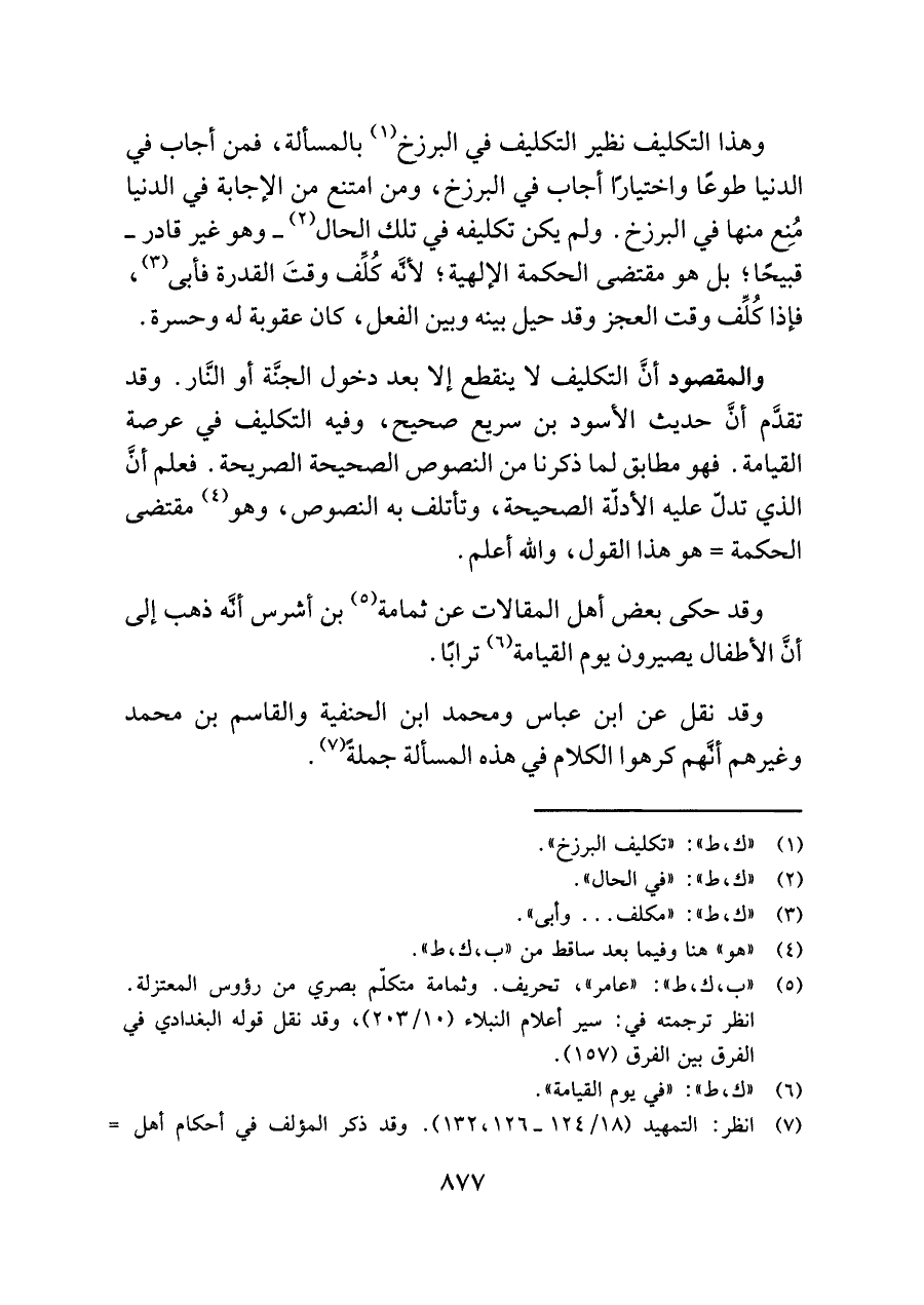 والمقصود أنَّ التكليف لا ينقطع إلا بعد دخول الجنَّة أو النَّار. وقد تقدَّم أنَّ حديث الأسود بن سريع صحيح، وفيه التكليف في عرصة القيامة. فهو مطابق لما ذكرنا من النصوص الصحيحة الصريحة. فعلم أنَّ الذي تدلّ عليه الأدلّة الصحيحة، وتأتلف به النصوص، وهو (¬٤) مقتضى الحكمة = هو هذا القول، واللَّه أعلم.