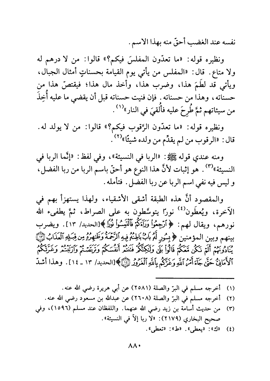 ونظيره قوله: "ما تعدّون المفلسَ فيكم؟ " قالوا: من لا درهم له ولا متاع. قال: "المفلس من يأتي يوم القيامة بحسناتٍ أمثال الجبال، ويأتي قد لطَمَ هذا، وضرب هذا، وأخذ مال هذا؛ فيقتصّ هذا من حسناته، وهذا من حسناته. فإن فنيت حسناته قبل أن يقضي ما عليه أُخِذَ من سيئاتهم ثمَّ طُرِحَ عليه فأُلقيَ في النار" (¬١).