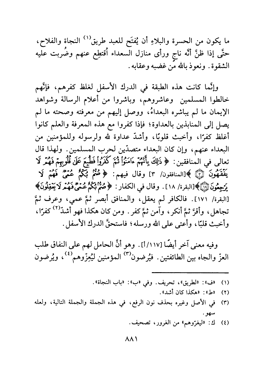 وإنَّما كانت هذه الطبقة في الدرك الأسفل لغلظ كفرهم، فإنَّهم خالطوا المسلمين وعاشروهم، وباشروا من أعلام الرسالة وشواهد الإيمان ما لم يباشره البعداءُ، ووصل إليهم من معرفته وصحته ما لم يصل إلى المنابذين بالعداوة؛ فإذا كفروا مع هذه المعرفة والعلم كانوا أغلظ كفرًا، وأخبث قلوبًا، وأشدّ عداوة للَّه ولرسوله وللمؤمنين من البعداء عنهم، وإن كان البعداء متصدّين لحرب المسلمين. ولهذا قال تعالى في المنافقين: {ذَلِكَ بِأَنَّهُمْ آمَنُوا ثُمَّ كَفَرُوا فَطُبِعَ عَلَى قُلُوبِهِمْ فَهُمْ لَا يَفْقَهُونَ (٣)} [المنافقون/ ٣]، وقال فيهم: {صُمٌّ بُكْمٌ عُمْيٌ فَهُمْ لَا يَرْجِعُونَ (١٨)} [البقرة/ ١٨]. وقال في الكفار: {صُمٌّ بُكْمٌ عُمْيٌ فَهُمْ لَا يَعْقِلُونَ} [البقرة/ ١٧١]. فالكافر لم يعقل، والمنافق أبصر ثمَّ عمي، وعرف ثمَّ تجاهل، وأقرَّ ثمَّ أنكر، وآمن ثمَّ كفر. ومن كان هكذا فهو أشدّ (¬٢) كفرًا، وأخبث قلبًا، وأعتى على اللَّه ورسله؛ فاستحق الدرك الأسفل.