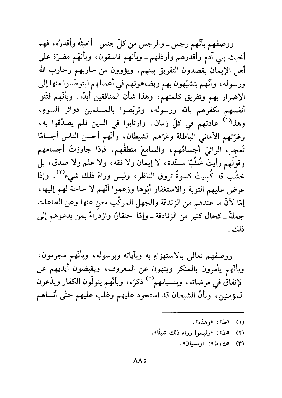 ووصفهم بأنّهم رجس -والرجس من كلّ جنس: أخبثُه وأقذرُه، فهم أخبث بني آدم وأقذرهم وأرذلهم- وبأنهم فاسقون، وبأنَّهم مضرّة على أهل الإيمان يقصدون التفريق بينهم، ويؤوون من حاربهم وحارب اللَّه ورسوله، وأنّهم يتشبّهون بهم ويضاهونهم في أعمالهم ليتوصّلوا منها إلى الإضرار بهم وتفريق كلمتهم، وهذا شأن المنافقين أبدًا. وبأنّهم فتَنوا أنفسهم بكفرهم باللَّه ورسوله، وتربّصوا بالمسلمين دوائر السوءِ، وهذا (¬١) عادتهم في كل زمان. وارتابوا في الدين فلم يصدّقوا به، وغرّتهم الأماني الباطلة وغرّهم الشيطان، وأنهم أحسن الناس أجسامًا تُعجِب الرائيَ أجسامُهم، والسامعَ منطقُهم، فإذا جاوزتَ أجسامهم وقولَهم رأيتَ خُشبًا مسنّدة، لا إيمان ولا فقه، ولا علم ولا صدق، بل خشُب قد كُسِيتْ كسوةً تروق الناظر، وليس وراءَ ذلك شيء (¬٢). وإذا عرض عليهم التوبة والاستغفار أبَوها وزعموا أنَّهم لا حاجة لهم إليها، إمّا لأنّ ما عندهم من الزندقة والجهل المركّب مغنٍ عنها وعن الطاعات جملةً -كحال كثير من الزنادقة- وإمَّا احتقارًا وازدراء بمن يدعوهم إلى ذلك.