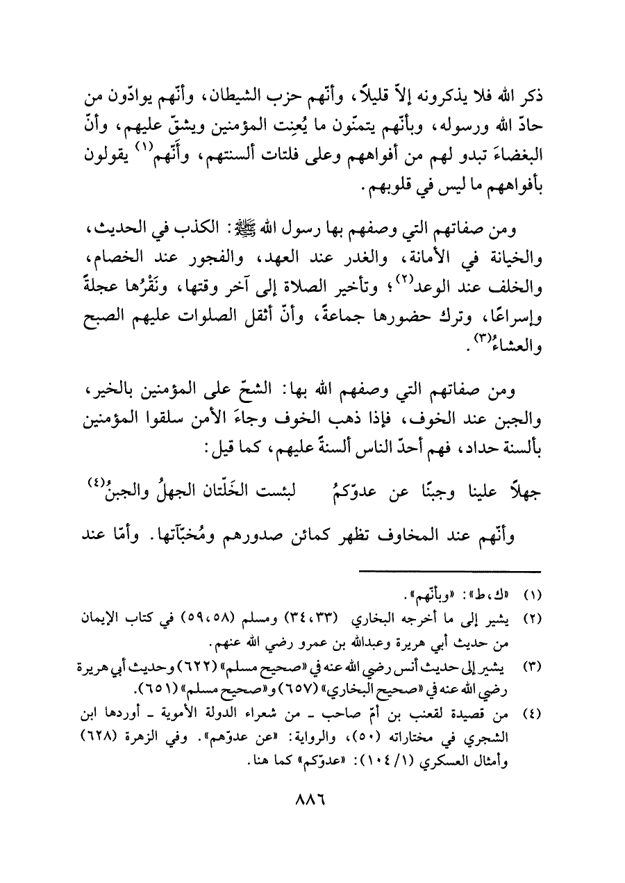 ومن صفاتهم التي وصفهم اللَّه بها: الشحّ على المؤمنين بالخير، والجبن عند الخوف، فإذا ذهب الخوف وجاءَ الأمن سلقوا المؤمنين بألسنة حداد، فهم أحدّ الناس ألسنةً عليهم، كما قيل: