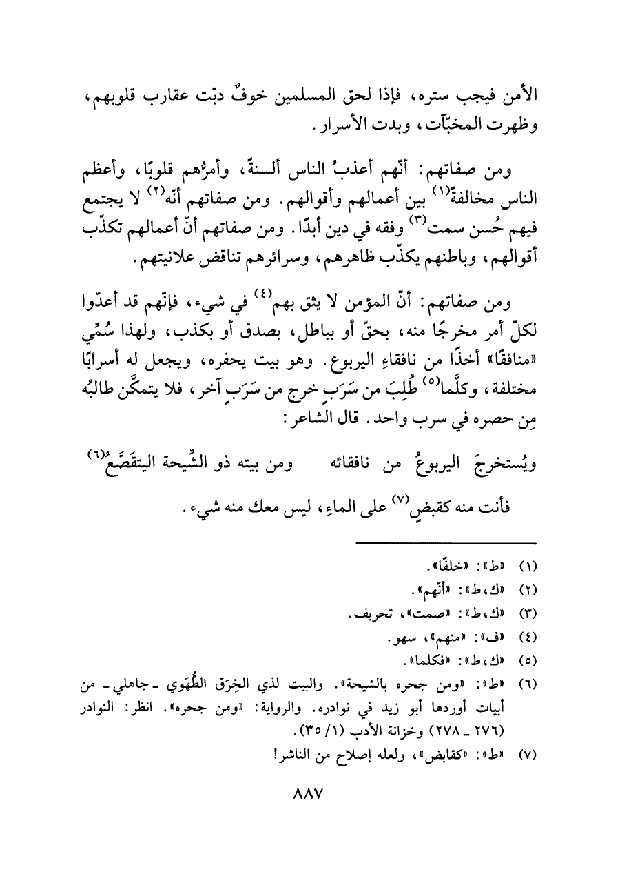 ومن صفاتهم: أنّ المؤمن لا يثق بهم (¬٤) في شيء، فإتهم قد أعدّوا لكلّ أمر مخرجًا منه، بحقّ أو بباطل، بصدق أو بكذب، ولهذا سُمِّي "منافقًا" أخذًا من نافقاءِ اليربوع. وهو بيت يحفره، ويجعل له أسرابًا مختلفة، وكلَّما (¬٥) طُلِبَ من سَرَبٍ خرج من سَرَبٍ آخر، فلا يتمكَّن طالبُه مِن حصره في سرب واحد. قال الشاعر:
