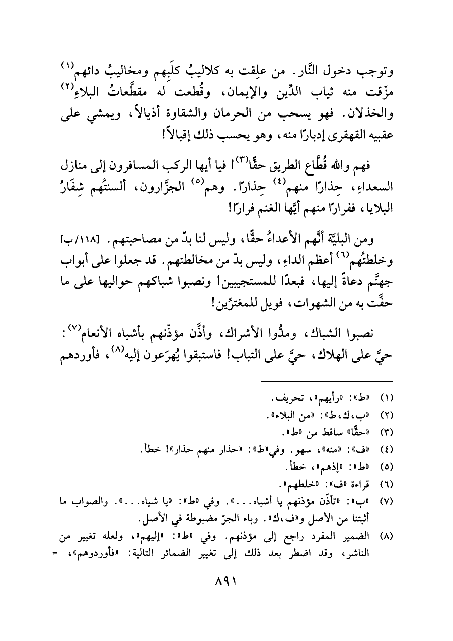 فهم واللَّه قُطَّاع الطريق حقًّا (¬٣)! فيا أيها الركب المسافرون إلى منازل السعداءِ، حِذارًا منهم (¬٤) حِذارًا. وهم (¬٥) الجزَّارون، ألسنتُهم شِفَارُ البلايا، ففرارًا منهم أيَّها الغنم فرارًا!