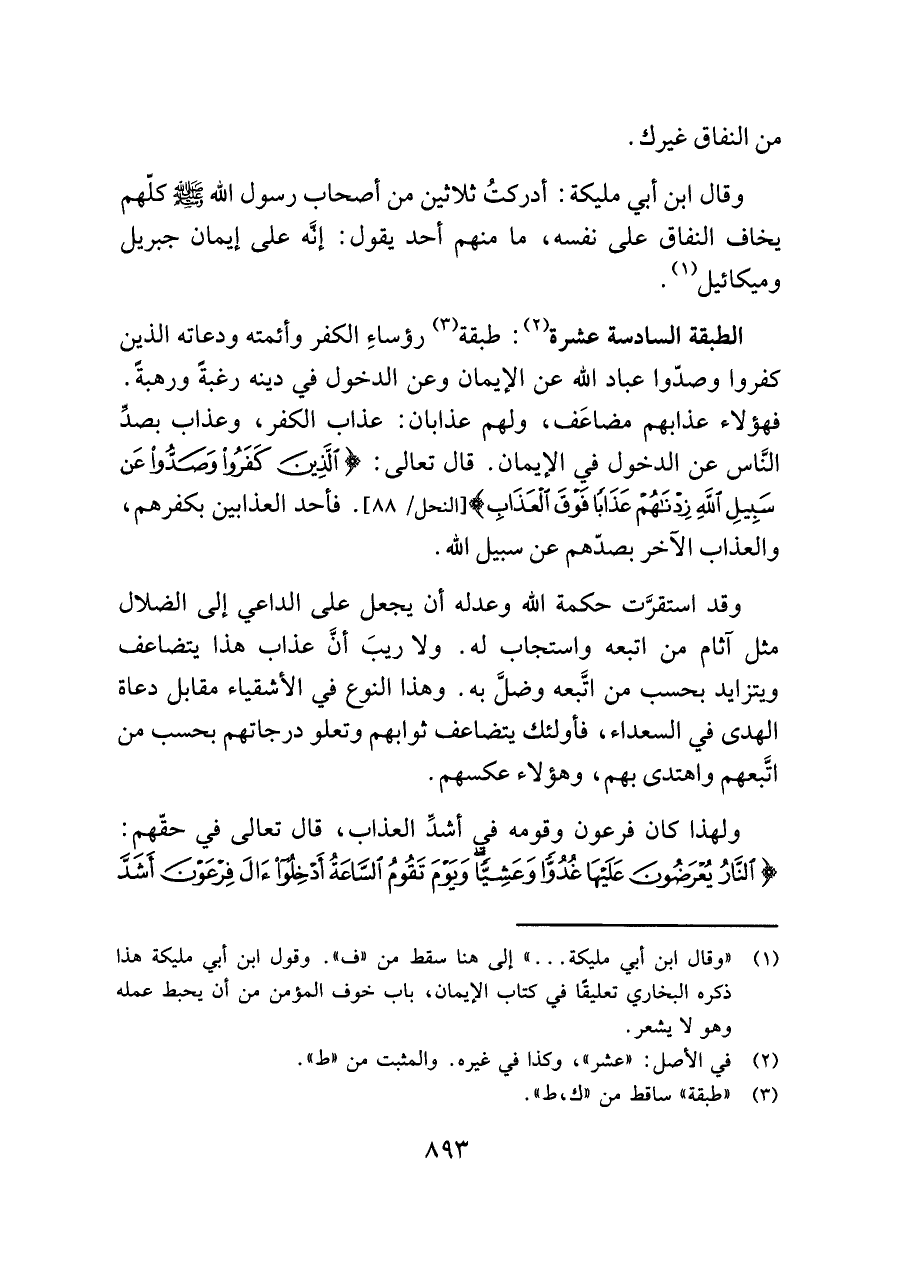 الطبقة السادسة عشرة (¬٢): طبقة (¬٣) رؤساءِ الكفر وأئمته ودعاته الذين كفروا وصدّوا عباد اللَّه عن الإيمان وعن الدخول في دينه رغبةً ورهبةً. فهؤلاء عذابهم مضاعَف، ولهم عذابان: عذاب الكفر، وعذاب بصدِّ النَّاس عن الدخول في الإيمان. قال تعالى: {الَّذِينَ كَفَرُوا وَصَدُّوا عَنْ سَبِيلِ اللَّهِ زِدْنَاهُمْ عَذَابًا فَوْقَ الْعَذَابِ} [النحل/ ٨٨]. فأحد العذابين بكفرهم، والعذاب الآخر بصدّهم عن سبيل اللَّه.