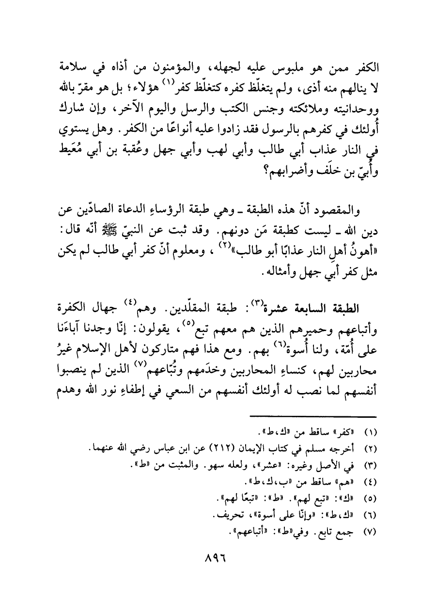 والمقصود أنّ هذه الطبقة -وهي طبقة الرؤساءِ الدعاة الصادّين عن دين اللَّه- ليست كطبقة مَن دونهم. وقد ثبت عن النبيّ -صلى اللَّه عليه وسلم- أنّه قال: "أهونُ أهلِ النار عذابًا أَبو طالب" (¬٢)، ومعلوم أنّ كفر أبي طالب لى يكن مثل كفر أبي جهل وأمثاله.
