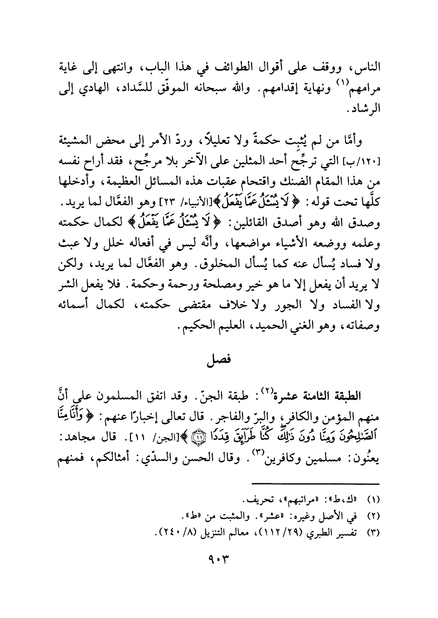 الطبقة الثامنة عشرة (¬٢): طبقة الجنّ. وقد اتفق المسلمون على أنَّ منهم المؤمن والكافر والبرّ والفاجر. قال تعالى إخبارًا عنهم: {وَأَنَّا مِنَّا الصَّالِحُونَ وَمِنَّا دُونَ ذَلِكَ كُنَّا طَرَائِقَ قِدَدًا (١١)} [الجن/ ١١] قال مجاهد: يعنُون: مسلمين وكافرين (¬٣). وقال الحسن والسدّي: أمثالكم، فمنهم