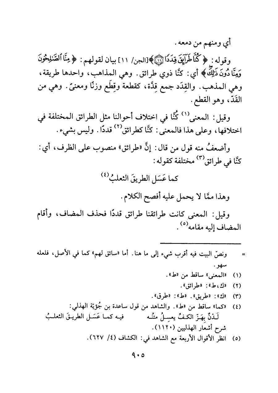 وأضعفُ منه قول من قال: إنَّ "طرائق" منصوب على الظرف، أي: كُنَّا في طرائق (¬٣) مختلفة كقوله: