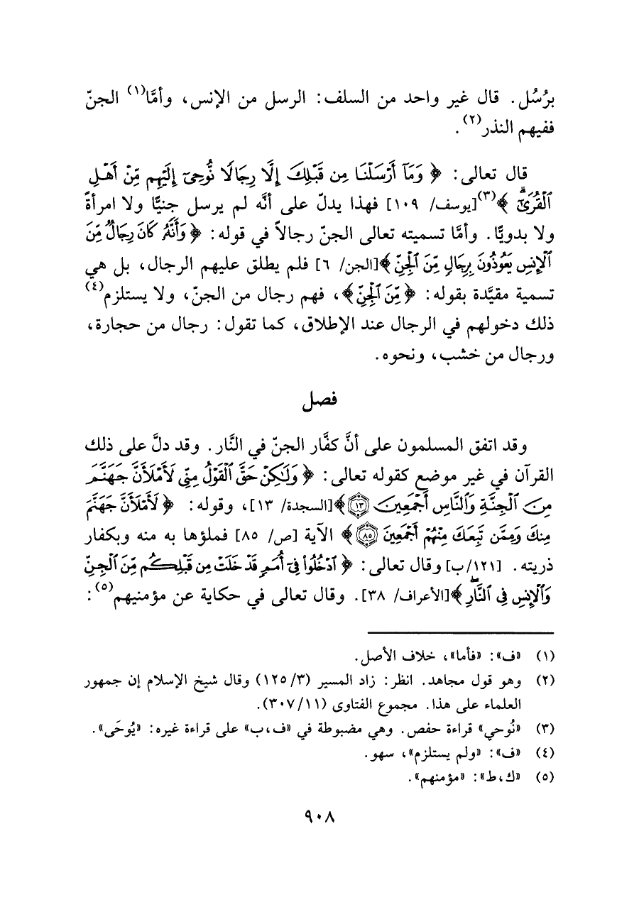 قال تعالى: {وَمَا أَرْسَلْنَا مِنْ قَبْلِكَ إِلَّا رِجَالًا نُوحِي إِلَيْهِمْ مِنْ أَهْلِ الْقُرَى} (¬٣) [يوسف/ ١٠٩] فهذا يدلّ على أَنَّه لم يرسل جنيًّا ولا امرأةً ولا بدويًّا. وأمَّا تسميته تعالى الجنّ رجالًا في قوله: {وَأَنَّهُ كَانَ رِجَالٌ مِنَ الْإِنْسِ يَعُوذُونَ بِرِجَالٍ مِنَ الْجِنِّ} [الجن/ ٦] فلم يطلق عليهم الرجال، بل هي تسمية مقيَّدة بقوله: {مِنَ الْجِنِّ}، فهم رجال من الجنّ، ولا يستلزم (¬٤) ذلك دخولهم في الرجال عند الإطلاق، كما تقول: رجال من حجارة، ورجال من خشب، ونحوه.