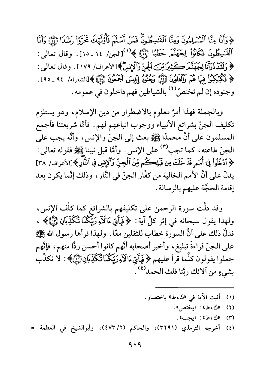 وقد دلَّت سورة الرحمن على تكليفهم بالشرائع كما كلّف الإنس، ولهذا يقول سبحانه في إثر كلِّ آية: {فَبِأَيِّ آلَاءِ رَبِّكُمَا تُكَذِّبَانِ (١٣)}، فدلَّ ذلك على أنَّ السورة خطاب للثقلين معًا. ولهذا قرأها رسول اللَّه -صلى اللَّه عليه وسلم- على الجنّ قراءةَ تبليغ، وأخبر أصحابه أنَّهم كانوا أحسن ردًّا منهم، فإنَّهم جعلوا يقولون كلَّما قرأ عليهم {فَبِأَيِّ آلَاءِ رَبِّكُمَا تُكَذِّبَانِ (١٣)}: لا نكذِّب بشيءٍ من آلائك ربَّنا فلك الحمد (¬٤).