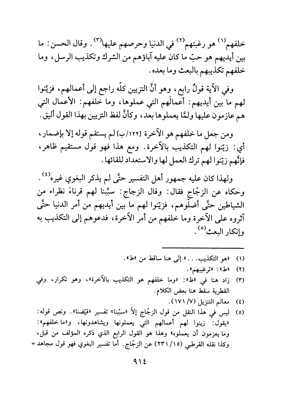 ومن جعل ما خلفهم هو الآخرة لم يستقم قوله إلا بإضمار، أي: زيّنوا لهم التكذيب بالآخرة. ومع هذا فهو قول مستقيم ظاهر، فإنَّهم زيّنوا لهم ترك العمل لها والاستعداد للقائها.