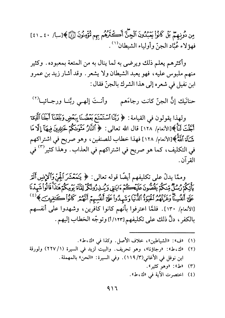 وأكثرهم يعلم ذلك ويرضى به لما ينال به من المتعة بمعبوده. وكثير منهم ملبوس عليه، فهو يعبد الشيطان ولا يشعر. وقد أشار زيد بن عمرو ابن نفيل في شعره إلى هذا الشرك بالجنّ فقال: