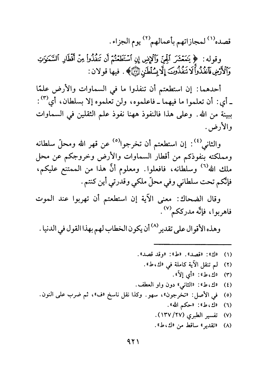 أحدهما: إن استطعتم أن تنفذوا ما في السماوات والأرض علمًا -أي: أن تعلموا ما فيهما- فاعلموه، ولن تعلموه إلا بسلطان، أي (¬٣): ببينة من اللَّه. وعلى هذا فالنفوذ ههنا نفوذ علم الثقلين في السماوات والأرض.
