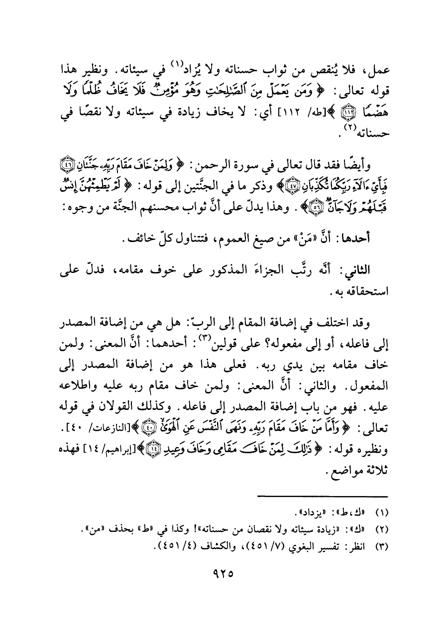 وقد اختلف في إضافة المقام إلى الربّ: هل هي من إضافة المصدر إلى فاعله، أو إلى مفعوله؟ على قولين (¬٣): أحدهما: أنَّ المعنى: ولمن خاف مقامه بين يدي ربه. فعلى هذا هو من إضافة المصدر إلى المفعول. والثاني: أنَّ المعنى: ولمن خاف مقام ربه عليه واطلاعه عليه. فهو من باب إضافة المصدر إلى فاعله. وكذلك القولان في قوله تعالى: {وَأَمَّا مَنْ خَافَ مَقَامَ رَبِّهِ وَنَهَى النَّفْسَ عَنِ الْهَوَى (٤٠)} [النازعات/ ٤٠]. ونظيره قوله: {ذَلِكَ لِمَنْ خَافَ مَقَامِي وَخَافَ وَعِيدِ (١٤)} [إبراهيم/ ١٤] فهذه ثلاثة مواضع.