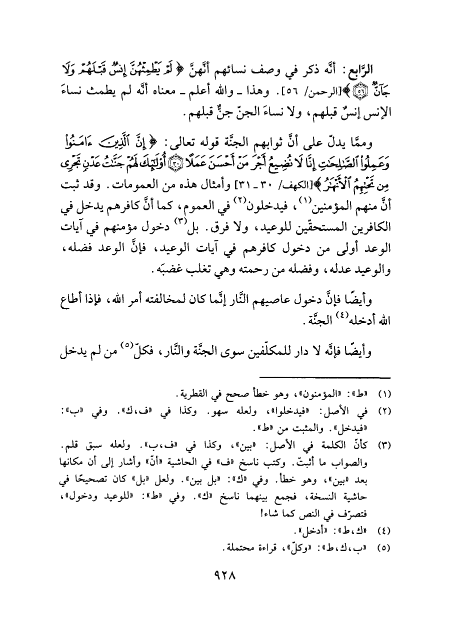 (¬٣) كأنّ الكلمة في الأصل: "بين"، وكذا في "ف، ب". ولعله سبق قلم. والصواب ما أثبتّ. وكتب ناسخ "ف" في الحاشية "أنّ" وأشار إلى أن مكانها بعد "بين"، وهو خطأ. وفي "ك": "بل بين". ولعل "بل" كان تصحيحًا في حاشية النسخة، فجمع بينهما ناسخ "ك". وفي "ط": "للوعيد ودخول"، فتصرّف في النص كما شاء!