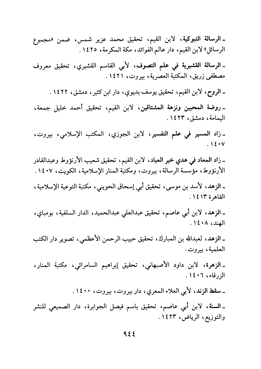 - الزهد، لأسد بن موسى، تحقيق أبي إسحاق الحويني، مكتبة التوعية الإسلامية، القاهرة ١٤١٣.
