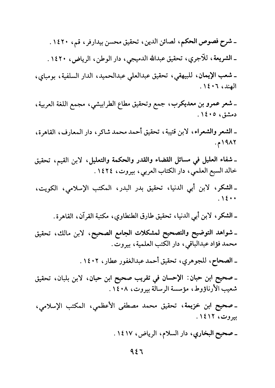 - شعب الإيمان، للبيهقي، تحقيق عبد العلي عبد الحميد، الدار السلفية، بومباي، الهند، ١٤٠٦.