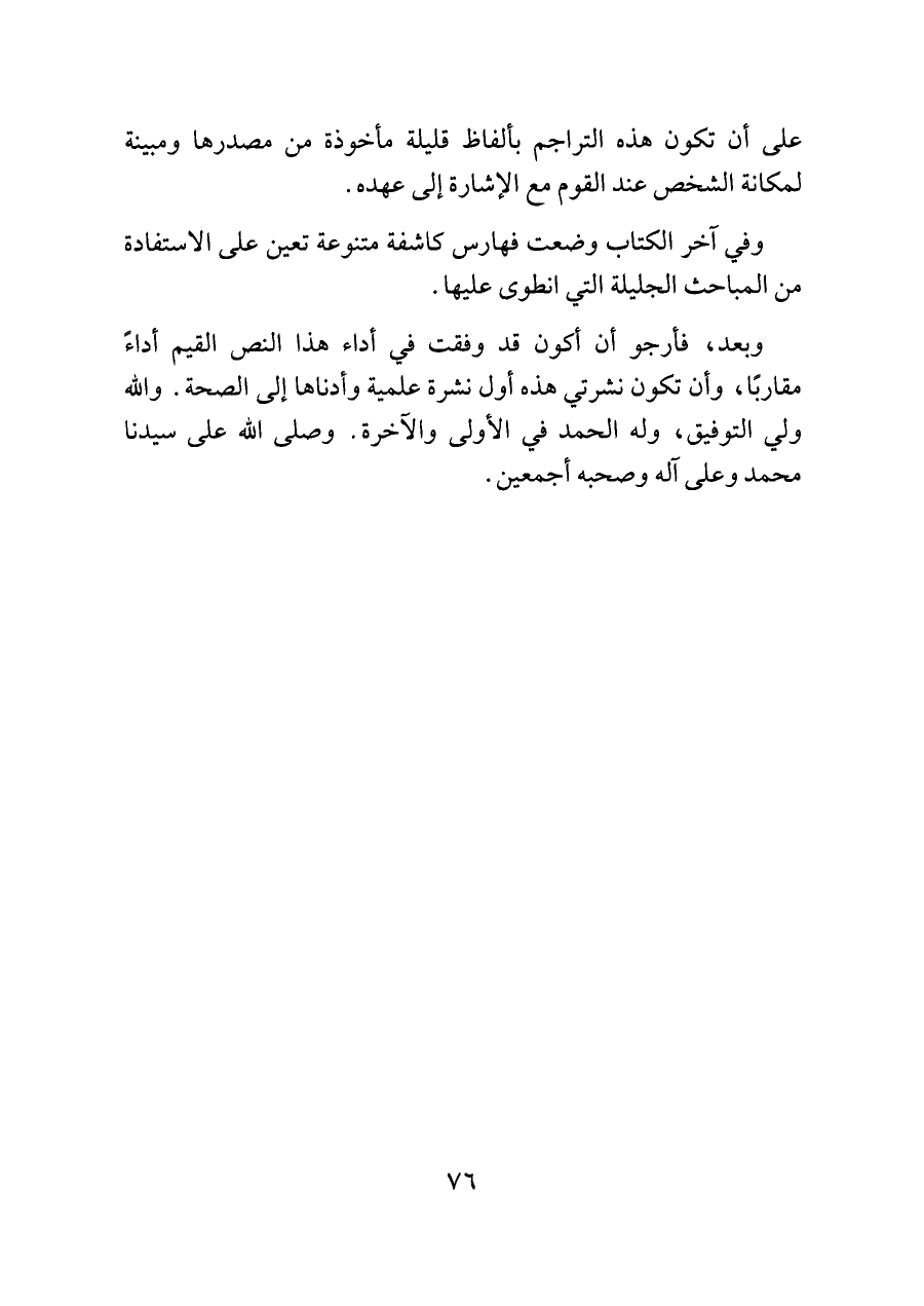 وبعد، فأرجو أن أكون قد وفقت في أداء هذا النص القيم أداءً مقاربًا، وأن تكون نشرتي هذه أول نشرة علمية وأدناها إلى الصحة. واللَّه ولي التوفيق، وله الحمد في الأولى والآخرة. وصلى اللَّه على سيدنا محمد وعلى آله وصحبه أجمعين.
