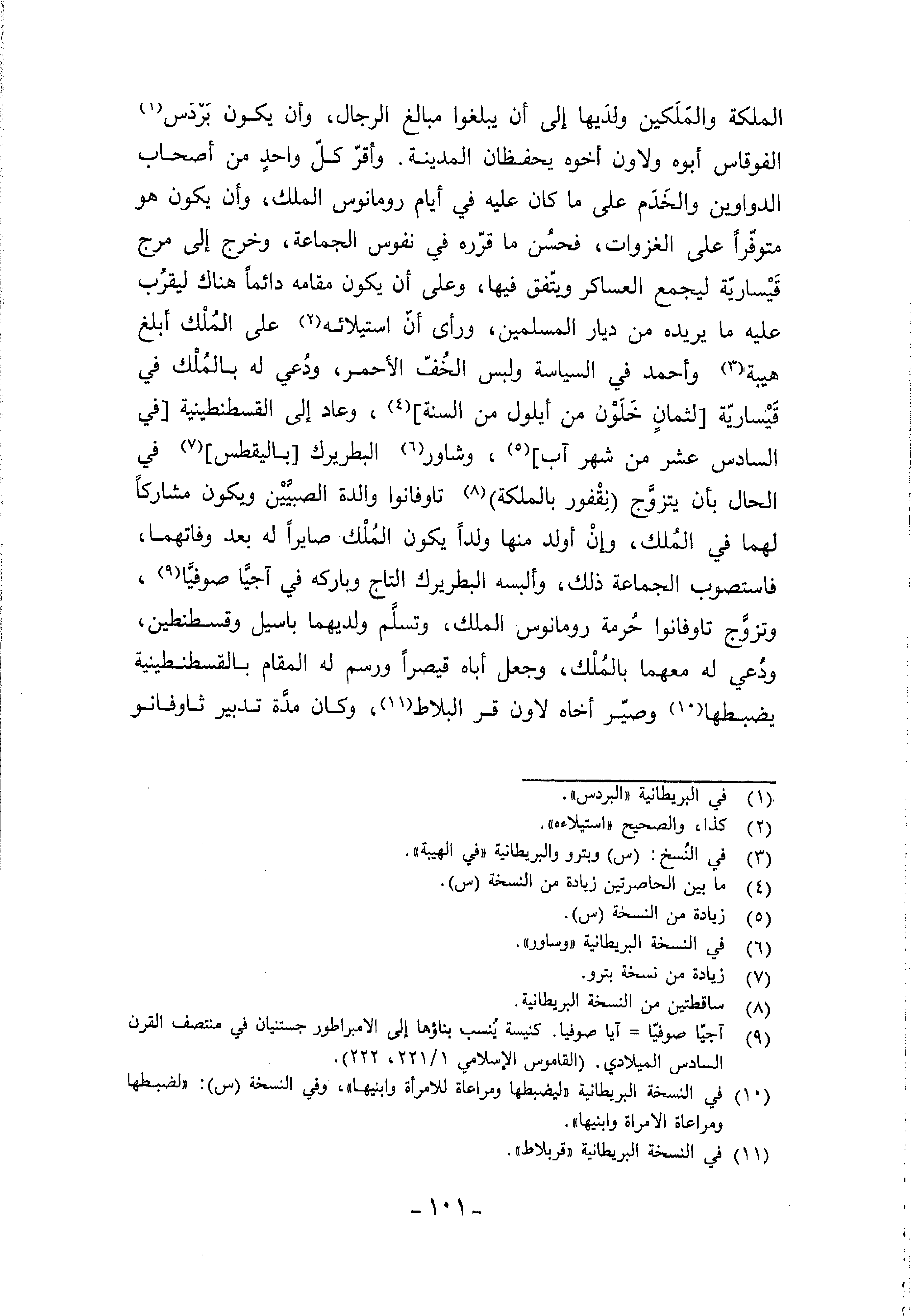 الملكة والملكين ولديها إلى أن يبلغوا مبالغ الرجال، وأن يكون بردس (¬1) الفوقاس أبوه ولاون أخوه يحفظان المدينة. وأقرّ كلّ واحد من أصحاب الدواوين والخدم على ما كان عليه في أيام رومانوس الملك، وأن يكون هو متوفّرا على الغزوات، فحسن ما قرّره في نفوس الجماعة، وخرج إلى مرج قيساريّة ليجمع العساكر ويتّفق فيها، وعلى أن يكون مقامه دائما هناك ليقرب عليه ما يريده من ديار المسلمين، ورأى أنّ استيلائه (¬2) على الملك أبلغ هيبة (¬3) وأحمد في السياسة ولبس الخفّ الأحمر، ودعي له بالملك في قيساريّة [لثمان خلون من أيلول من السنة] (¬4)، وعاد إلى القسطنطينية [في السادس عشر من شهر آب] (¬5)، وشاور (¬6) البطريرك [باليقطس] (¬7) في الحال بأن يتزوّج (نقفور بالملكة) (¬8) تاوفانوا والدة الصبيّين ويكون مشاركا لهما في الملك، وإن أولد منها ولدا يكون الملك صايرا له بعد وفاتهما، فاستصوب الجماعة ذلك، وألبسه البطريرك التاج وباركه في آجيّا صوفيّا (¬9)،