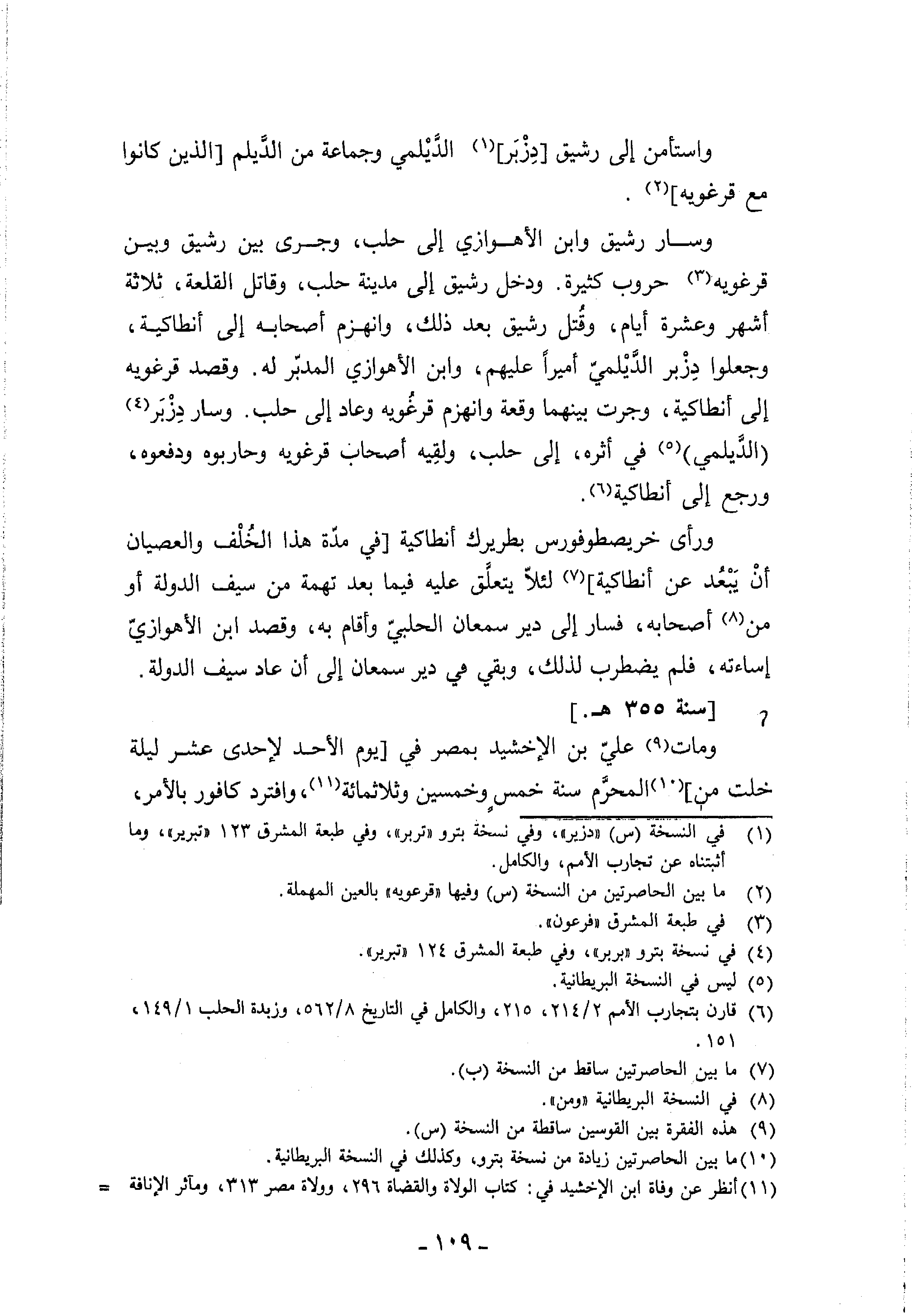 وسار رشيق وابن الأهوازي إلى حلب، وجرى بين رشيق وبين قرغويه (¬3) حروب كثيرة. ودخل رشيق إلى مدينة حلب، وقاتل القلعة، ثلاثة أشهر وعشرة أيام، وقتل رشيق بعد ذلك، وانهزم أصحابه إلى أنطاكية، وجعلوا دزبر الدّيلميّ أميرا عليهم، وابن الأهوازي المدبّر له. وقصد قرغويه إلى أنطاكية، وجرت بينهما وقعة وانهزم قرغويه وعاد إلى حلب. وسار دزبر (¬4) (الدّيلمي) (¬5) في أثره، إلى حلب، ولقيه أصحاب قرغويه وحاربوه ودفعوه، ورجع إلى أنطاكية (¬6).