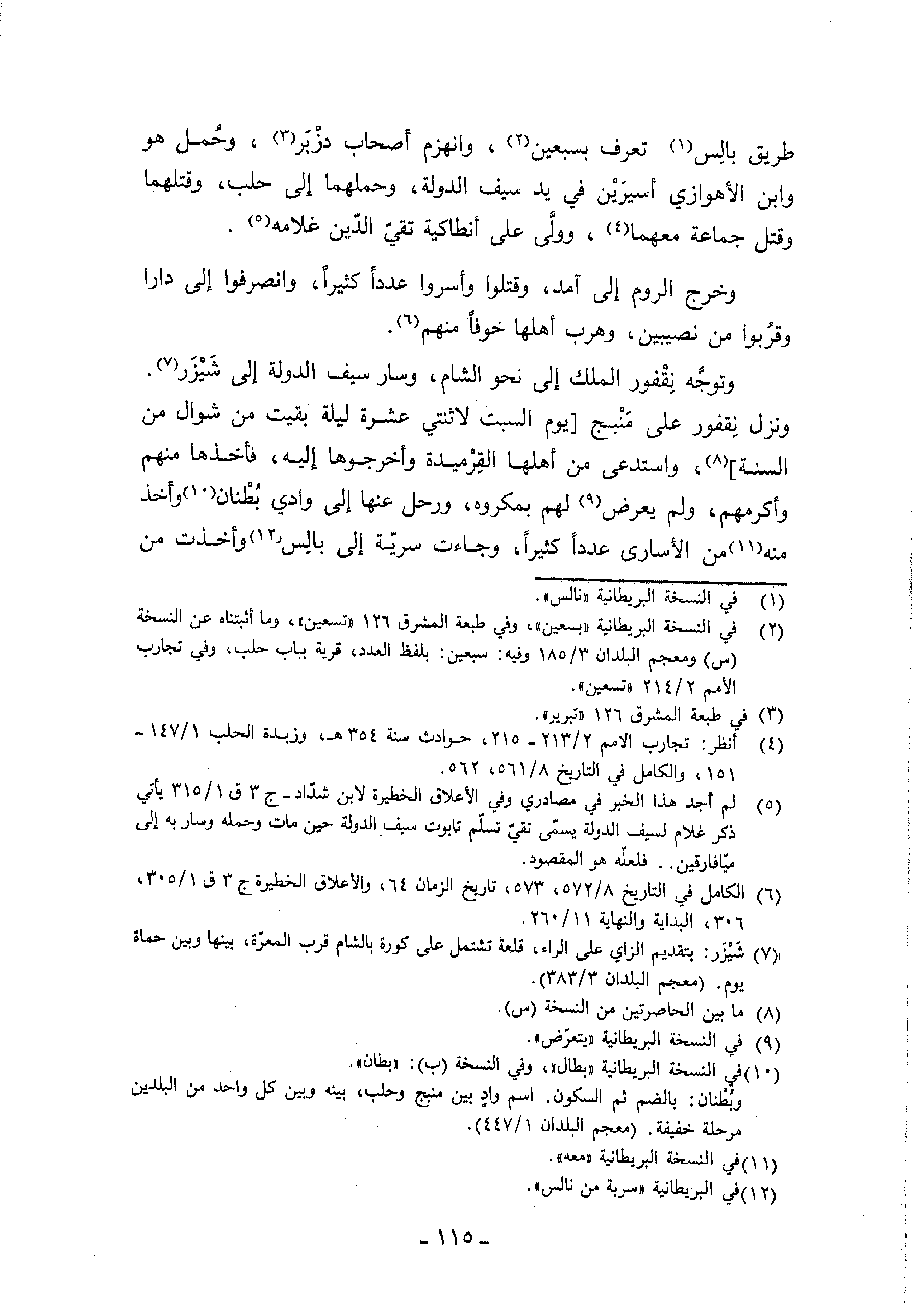 (¬2) في النسخة البريطانية «بسعين»، وفي طبعة المشرق 126 «تسعين»، وما أثبتناه عن النسخة (س) ومعجم البلدان 3/ 185 وفيه: سبعين: بلفظ العدد، قرية بباب حلب، وفي تجارب الأمم 2/ 214 «تسعين».