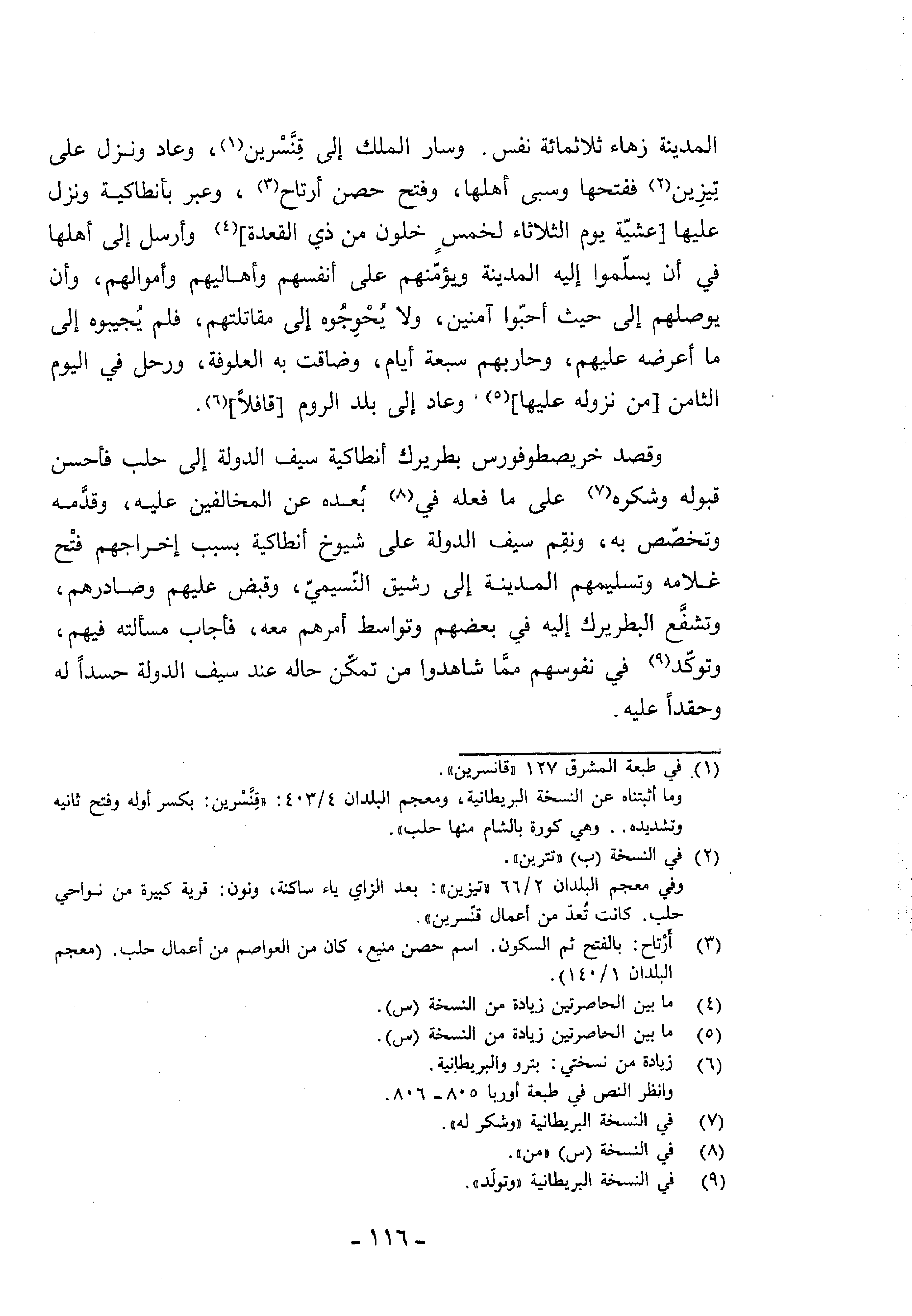 (¬1) في طبعة المشرق 127 «قانسرين». وما أثبتناه عن النسخة البريطانية، ومعجم البلدان 4/ 403: «قنّسرين: بكسر أوله وفتح ثانيه وتشديده. . وهي كورة بالشام منها حلب».