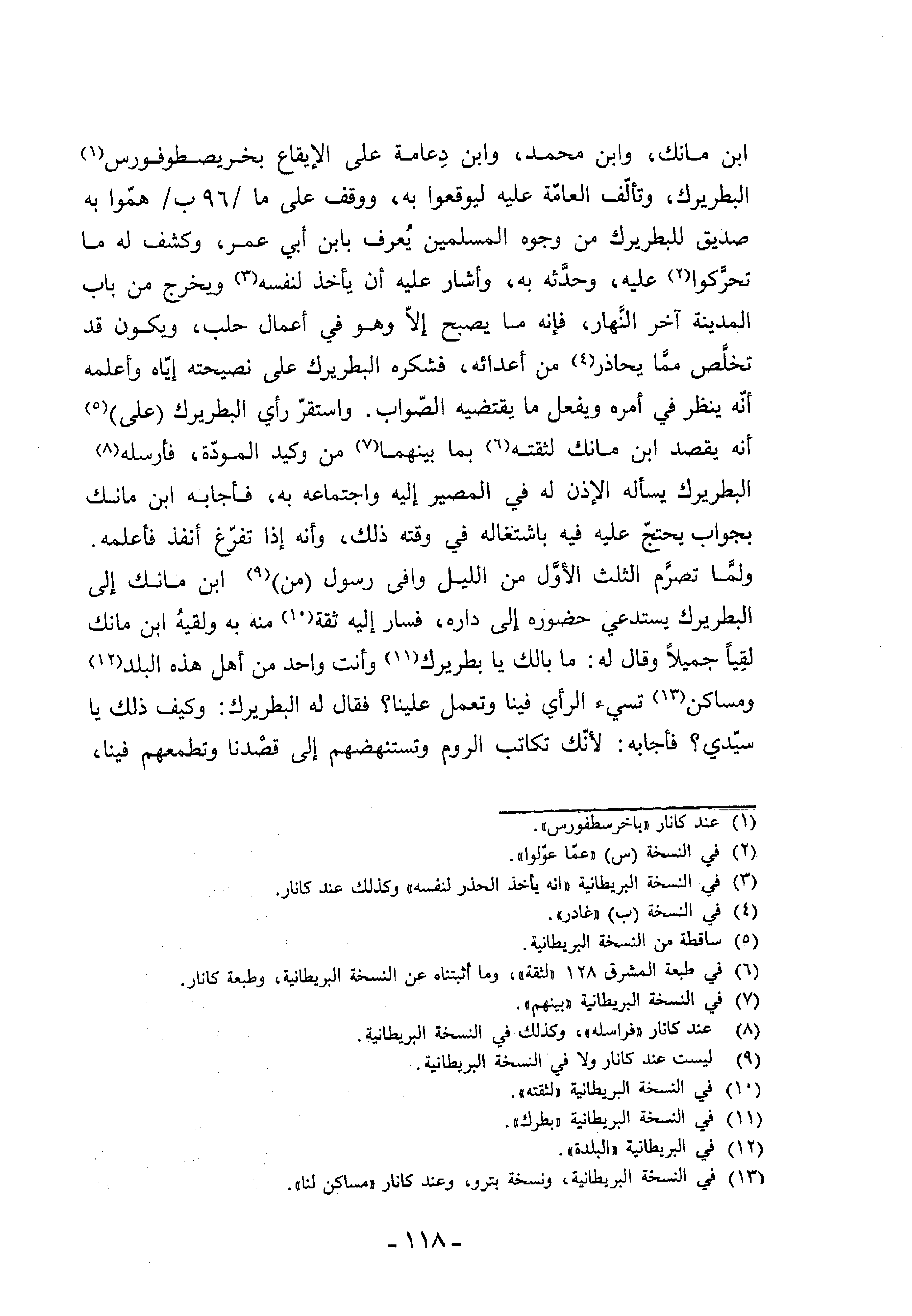 ولمّا تصرّم الثلث الأوّل من الليل وافى رسول (من) (¬9) ابن مانك إلى البطريرك يستدعي حضوره إلى داره، فسار إليه ثقة (¬10) منه به ولقيه ابن مانك لقيا جميلا وقال له: ما بالك يا بطريرك (¬11) وأنت واحد من أهل هذه البلد (¬12) ومساكن (¬13) تسيء الرأي فينا وتعمل علينا؟ فقال له البطريرك: وكيف ذلك يا سيّدي؟ فأجابه: لأنّك تكاتب الروم وتستنهضهم إلى قصدنا وتطمعهم فينا،