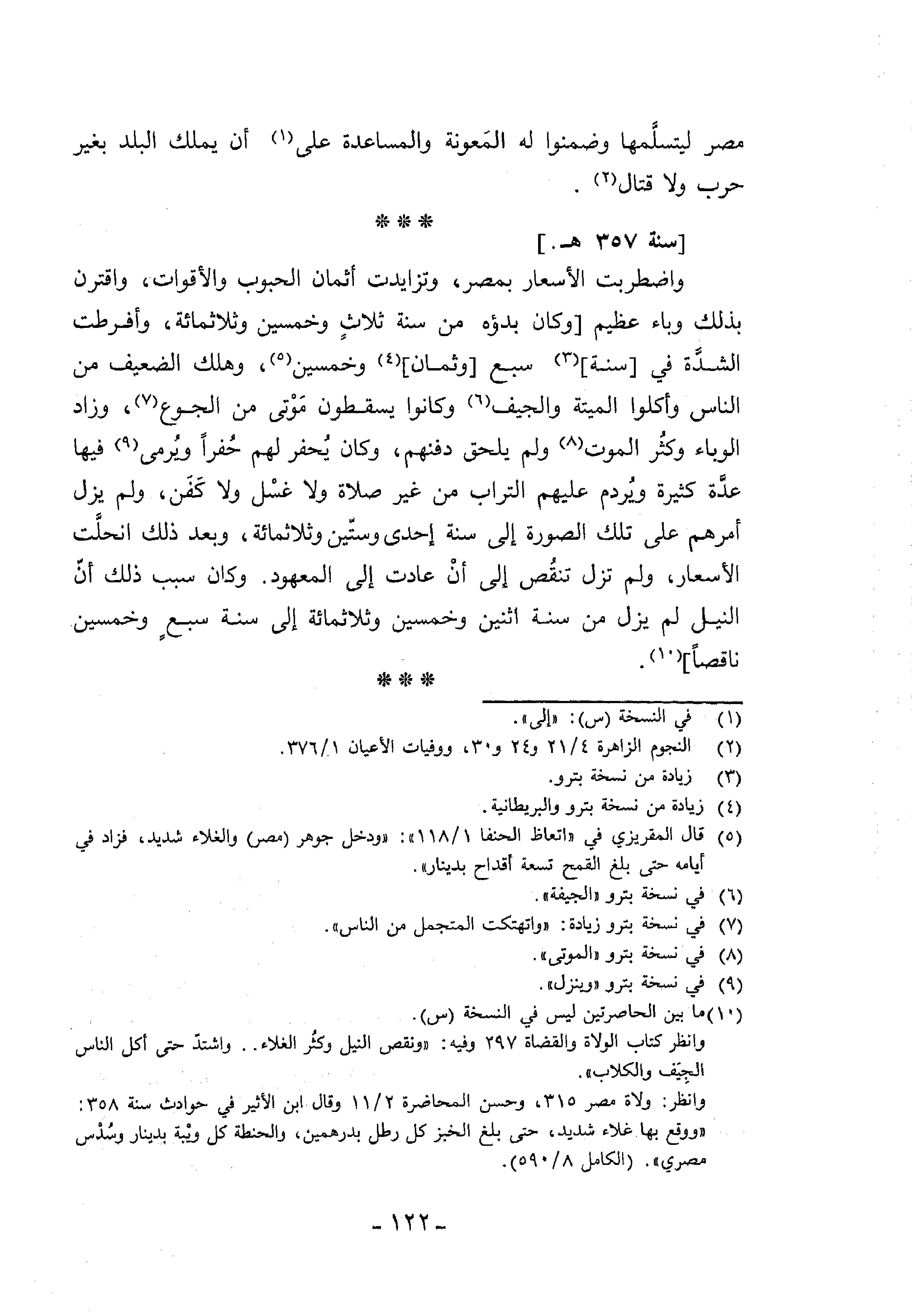واضطربت الأسعار بمصر، وتزايدت أثمان الحبوب والأقوات، واقترن بذلك وباء عظيم [وكان بدؤه من سنة ثلاث وخمسين وثلاثمائة، وأفرطت الشدّة في [سنة] (¬3) سبع [وثمان] (¬4) وخمسين (¬5)، وهلك الضعيف من الناس وأكلوا الميتة والجيف (¬6) وكانوا يسقطون موتى من الجوع (¬7)، وزاد الوباء وكثر الموت (¬8) ولم يلحق دفنهم، وكان يحفر لهم حفرا ويرمى (¬9) فيها عدّة كثيرة ويردم عليهم التراب من غير صلاة ولا غسل ولا كفن، ولم يزل أمرهم على تلك الصورة إلى سنة إحدى وستّين وثلاثمائة، وبعد ذلك انحلّت الأسعار، ولم تزل تنقص إلى أن عادت إلى المعهود. وكان سبب ذلك أنّ النيل لم يزل من سنة اثنين وخمسين وثلاثمائة إلى سنة سبع وخمسين ناقصا] (¬10).