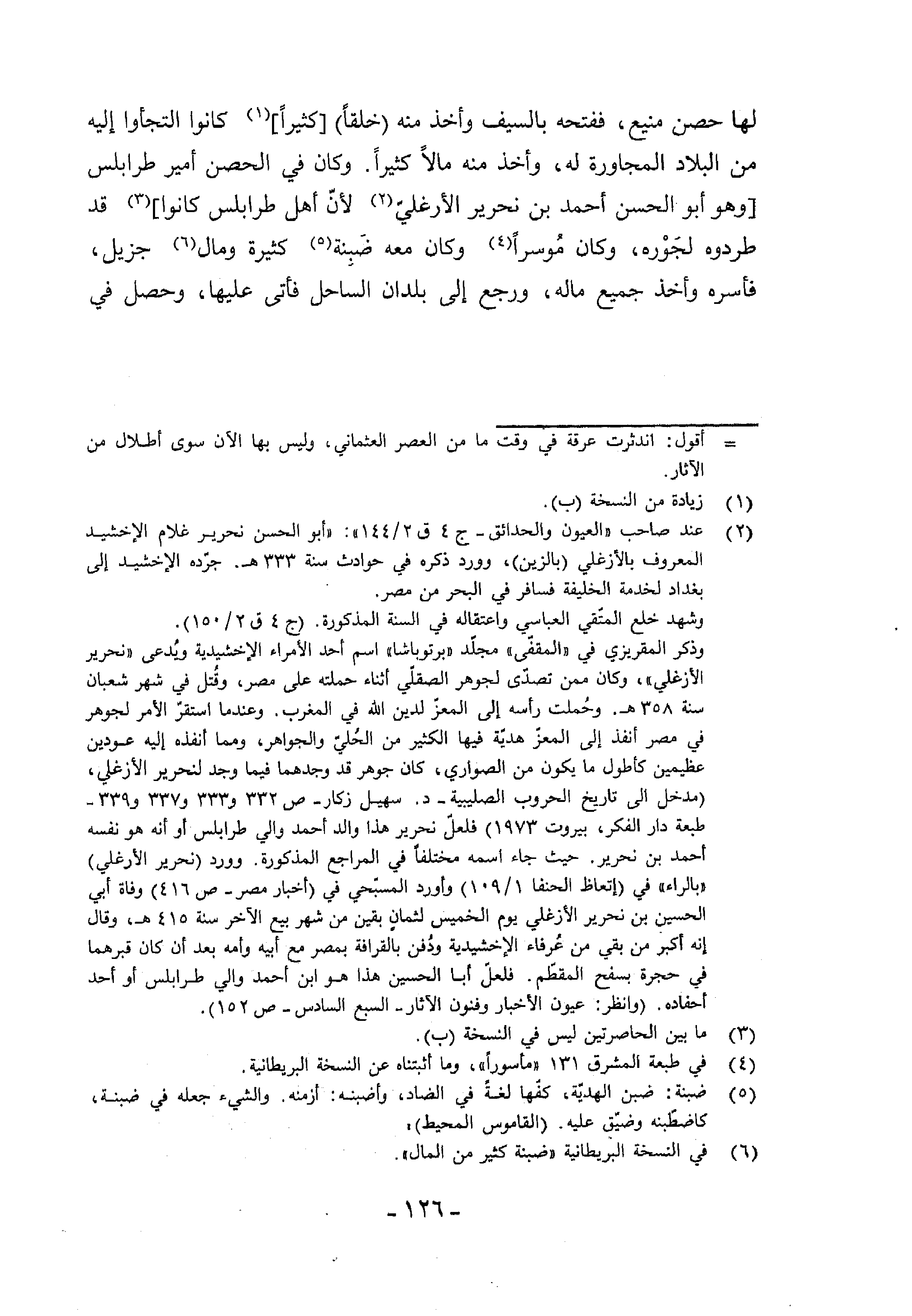 (¬2) عند صاحب «العيون والحدائق-ج 4 ق 2/ 144»: «أبو الحسن نحرير غلام الإخشيد المعروف بالأزغلي (بالزين)، وورد ذكره في حوادث سنة 333 هـ. جرّده الإخشيد إلى بغداد لخدمة الخليفة فسافر في البحر من مصر. وشهد خلع المتّقي العباسي واعتقاله في السنة المذكورة. (ج 4 ق 2/ 150). وذكر المقريزي في «المقفّى» مجلّد «برتوباشا» اسم أحد الأمراء الإخشيدية ويدعى «نحرير الأزغلي»، وكان ممن تصدّى لجوهر الصقلّي أثناء حملته على مصر، وقتل في شهر شعبان سنة 358 هـ. وحملت رأسه إلى المعزّ لدين الله في المغرب. وعندما استقرّ الأمر لجوهر في مصر أنفذ إلى المعزّ هديّة فيها الكثير من الحليّ والجواهر، ومما أنفذه إليه عودين عظيمين كأطول ما يكون من الصواري، كان جوهر قد وجدهما فيما وجد لنحرير الأزغلي، (مدخل الى تاريخ الحروب الصليبية-د. سهيل زكار-ص 332 و 333 و 337 و 339 - طبعة دار الفكر، بيروت 1973) فلعلّ نحرير هذا والد أحمد والي طرابلس أو أنه هو نفسه أحمد بن نحرير. حيث جاء اسمه مختلفا في المراجع المذكورة. وورد (نحرير الأرغلي) «بالراء» في (إتعاظ الحنفا 1/ 109) وأورد المسبّحي في (أخبار مصر-ص 416) وفاة أبي الحسين بن نحرير الأزغلي يوم الخميس لثمان بقين من شهر بيع الآخر سنة 415 هـ، وقال إنه أكبر من بقي من عرفاء الإخشيدية ودفن بالقرافة بمصر مع أبيه وأمه بعد أن كان قبرهما في حجرة بسفح المقطّم. فلعلّ أبا الحسين هذا هو ابن أحمد والي طرابلس أو أحد أحفاده. (وانظر: عيون الأخبار وفنون الآثار-السبع السادس-ص 152).