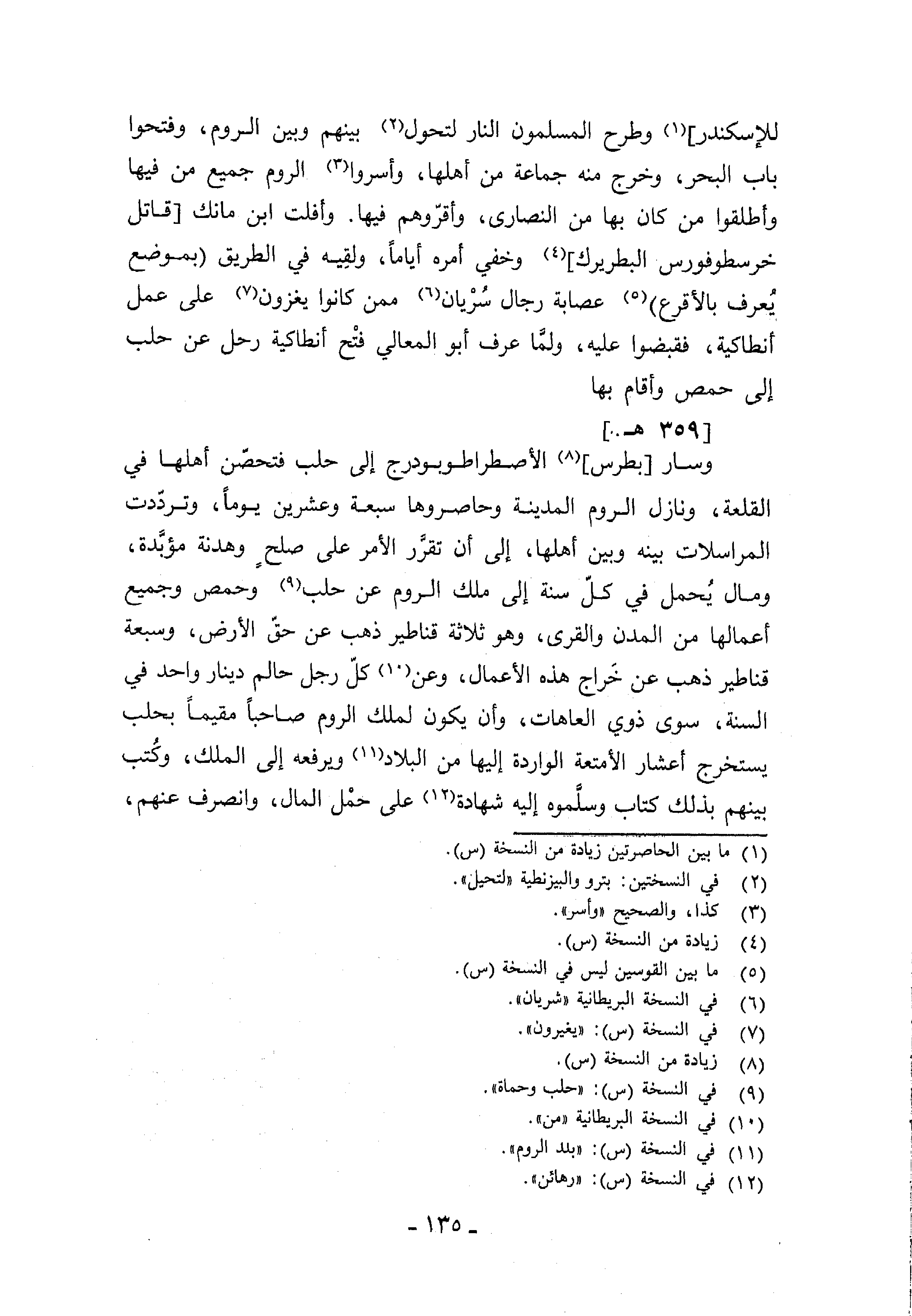 وسار [بطرس] (¬8) الأصطراطوبودرج إلى حلب فتحصّن أهلها في القلعة، ونازل الروم المدينة وحاصروها سبعة وعشرين يوما، وتردّدت المراسلات بينه وبين أهلها، إلى أن تقرّر الأمر على صلح وهدنة مؤبّدة، ومال يحمل في كلّ سنة إلى ملك الروم عن حلب (¬9) وحمص وجميع أعمالها من المدن والقرى، وهو ثلاثة قناطير ذهب عن حقّ الأرض، وسبعة قناطير ذهب عن خراج هذه الأعمال، وعن (¬10) كلّ رجل حالم دينار واحد في السنة، سوى ذوي العاهات، وأن يكون لملك الروم صاحبا مقيما بحلب يستخرج أعشار الأمتعة الواردة إليها من البلاد (¬11) ويرفعه إلى الملك، وكتب بينهم بذلك كتاب وسلّموه إليه شهادة (¬12) على حمل المال، وانصرف عنهم،