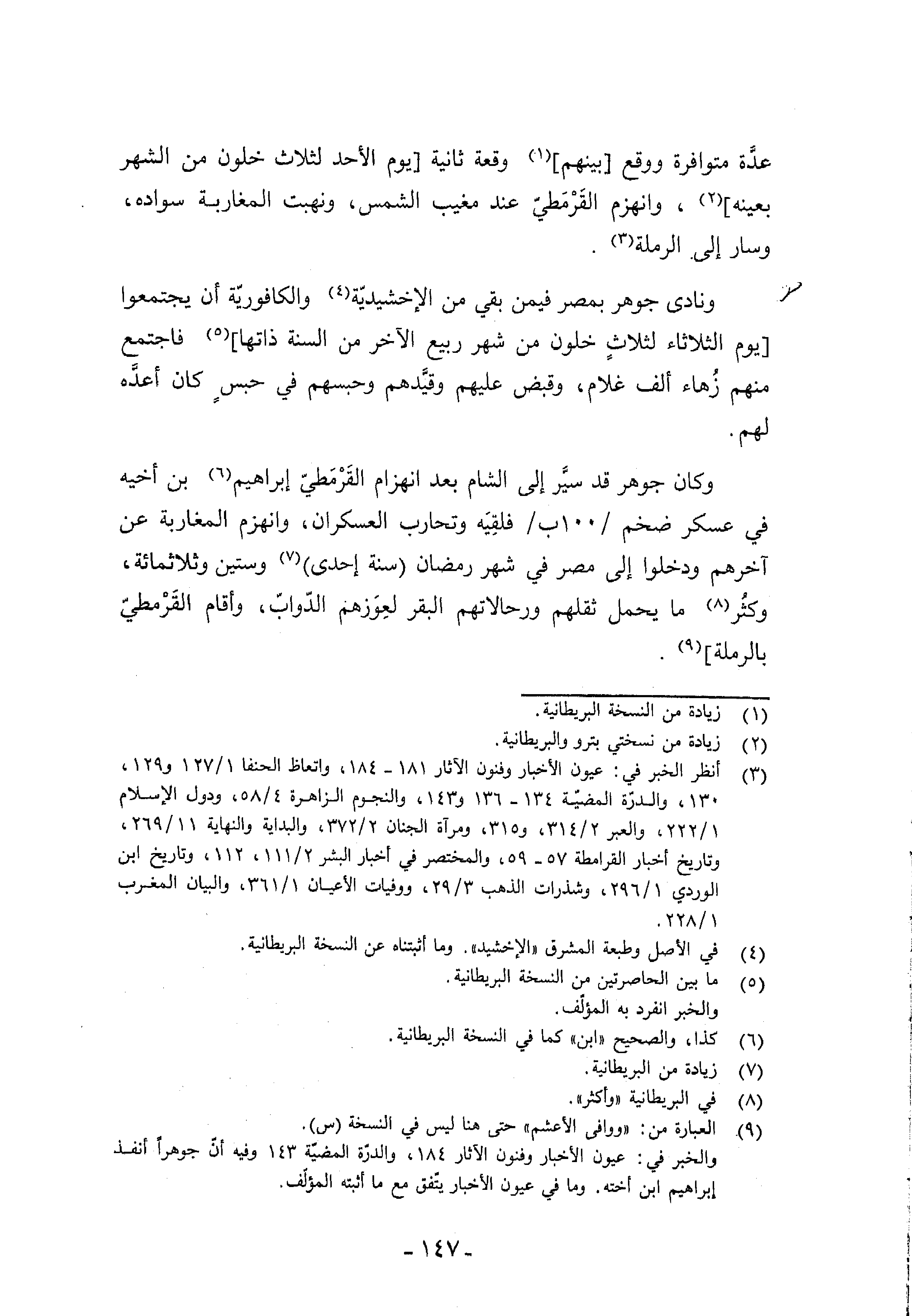 (¬3) أنظر الخبر في: عيون الأخبار وفنون الآثار 181 - 184، واتعاظ الحنفا 1/ 127 و 129، 130، والدرّة المضيّة 134 - 136 و 143، والنجوم الزاهرة 4/ 58، ودول الإسلام 1/ 222، والعبر 2/ 314، و 315، ومرآة الجنان 2/ 372، والبداية والنهاية 11/ 269، وتاريخ أخبار القرامطة 57 - 59، والمختصر في أخبار البشر 2/ 111،112، وتاريخ ابن الوردي 1/ 296، وشذرات الذهب 3/ 29، ووفيات الأعيان 1/ 361، والبيان المغرب 1/ 228.