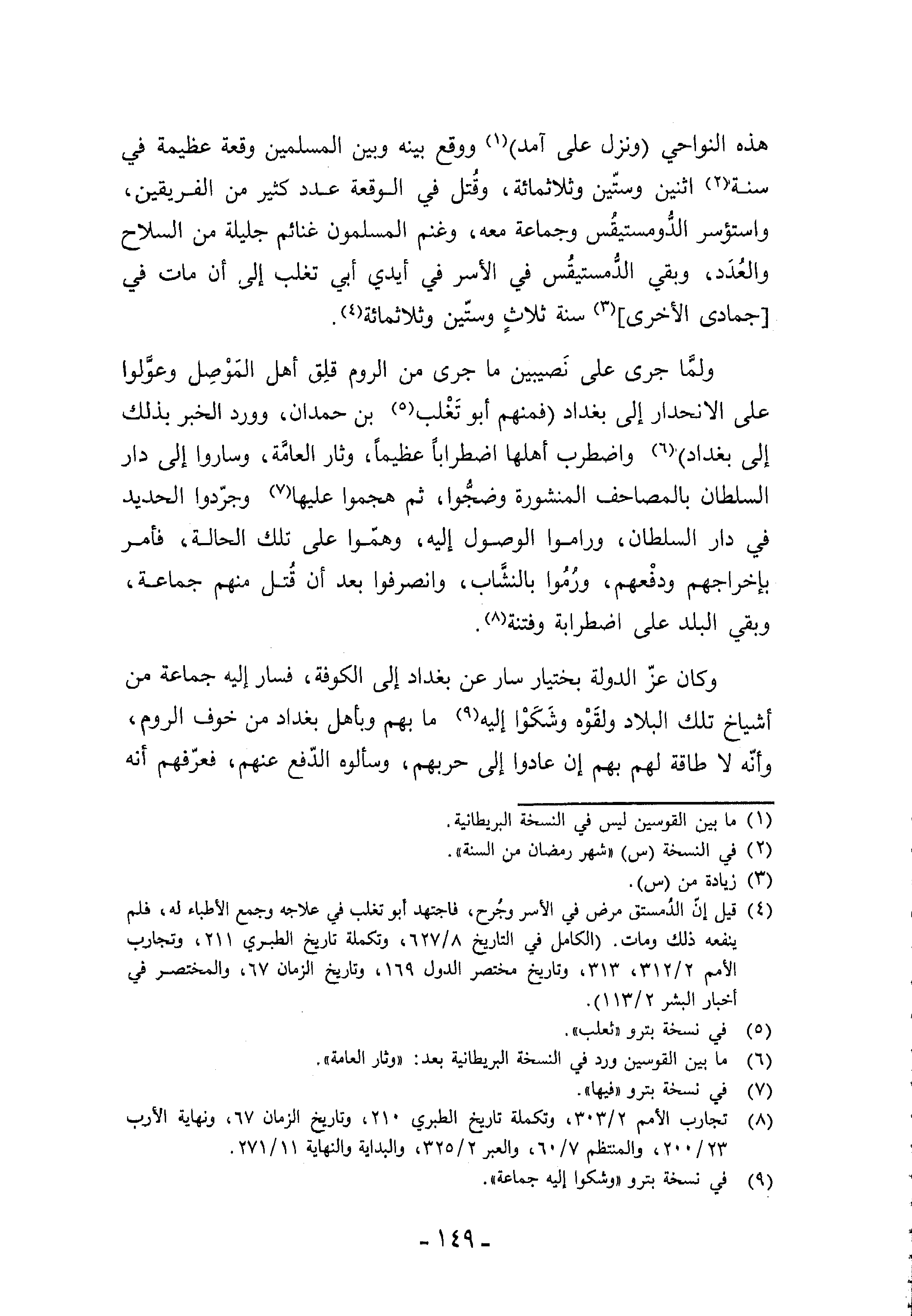 (¬8) تجارب الأمم 2/ 303، وتكملة تاريخ الطبري 210، وتاريخ الزمان 67، ونهاية الأرب 23/ 200، والمنتظم 7/ 60، والعبر 2/ 325، والبداية والنهاية 11/ 271.