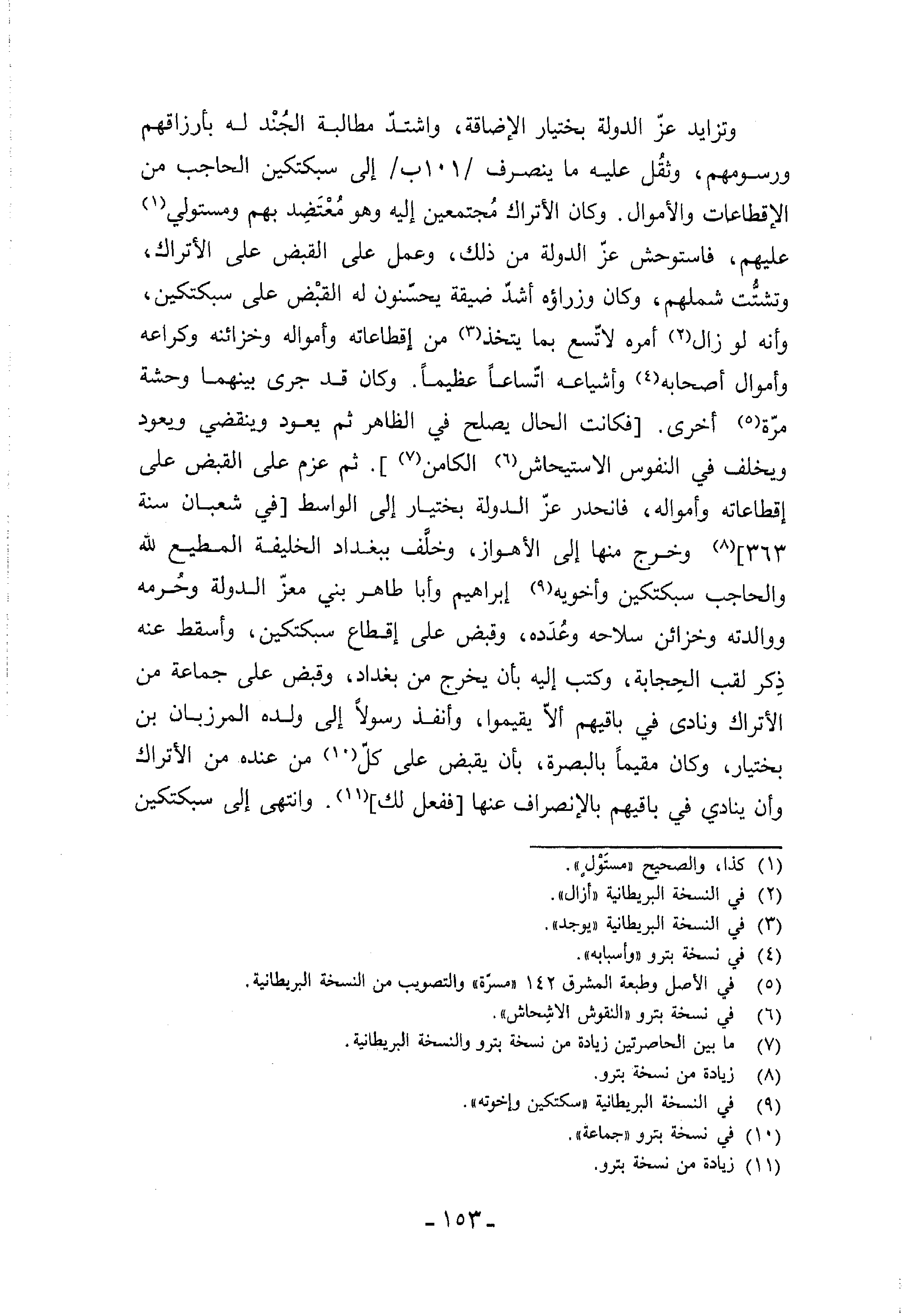 363] (¬8) وخرج منها إلى الأهواز، وخلّف ببغداد الخليفة المطيع لله والحاجب سبكتكين وأخويه (¬9) إبراهيم وأبا طاهر بني معزّ الدولة وحرمه ووالدته وخزائن سلاحه وعدده، وقبض على إقطاع سبكتكين، وأسقط عنه ذكر لقب الحجابة، وكتب إليه بأن يخرج من بغداد، وقبض على جماعة من الأتراك ونادى في باقيهم ألاّ يقيموا، وأنفذ رسولا إلى ولده المرزبان بن بختيار، وكان مقيما بالبصرة، بأن يقبض على كلّ (¬10) من عنده من الأتراك وأن ينادي في باقيهم بالإنصراف عنها [ففعل لك] (¬11). وانتهى إلى سبكتكين