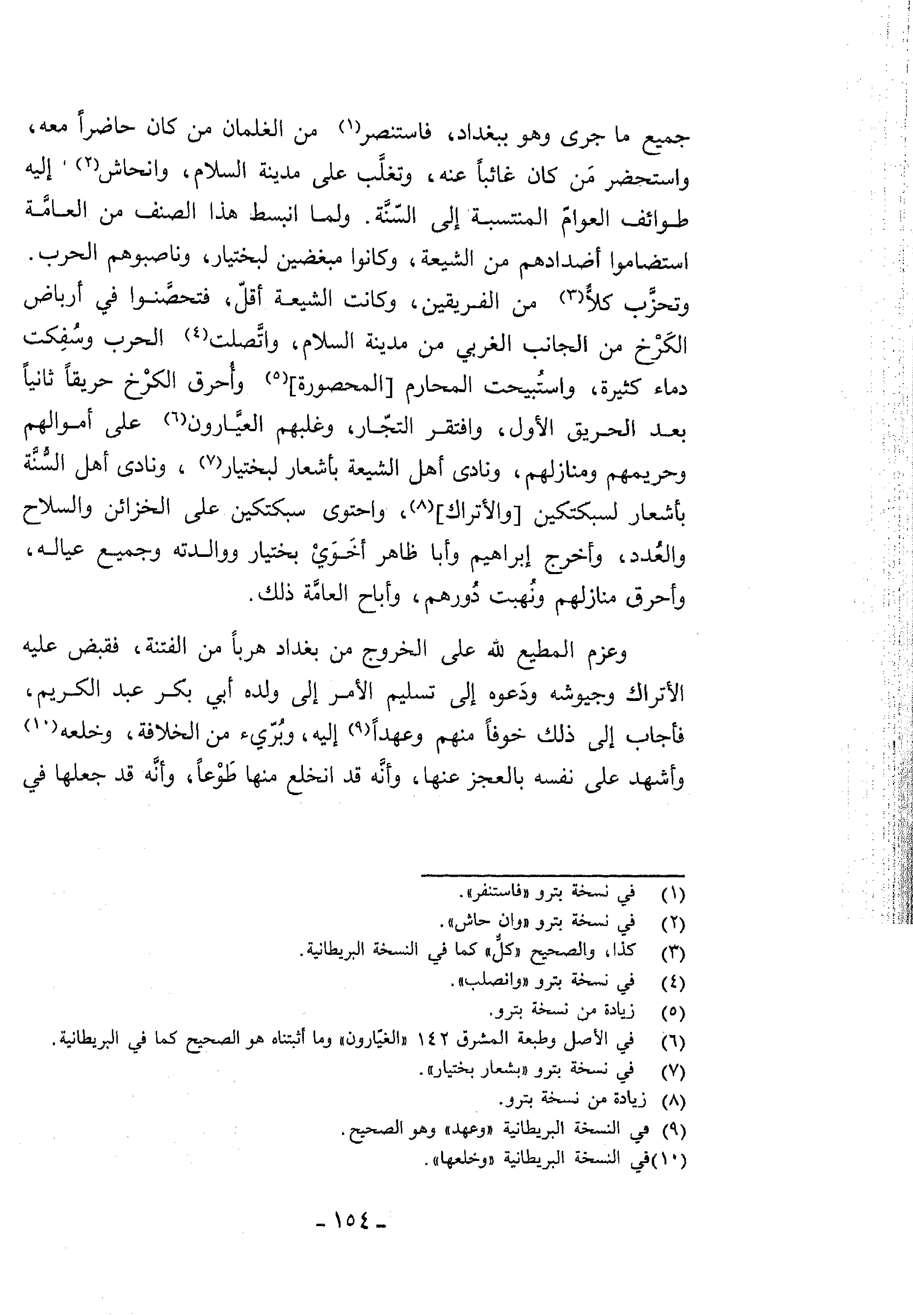 وتحزّب كلاّ (¬3) من الفريقين، وكانت الشيعة أقلّ، فتحصّنوا في أرباض الكرخ من الجانب الغربي من مدينة السلام، واتّصلت (¬4) الحرب وسفكت دماء كثيرة، واستبيحت المحارم [المحصورة] (¬5) وأحرق الكرخ حريقا ثانيا بعد الحريق الأول، وافتقر التجّار، وغلبهم العيّارون (¬6) على أموالهم وحريمهم ومنازلهم، ونادى أهل الشيعة بأشعار لبختيار (¬7)، ونادى أهل السّنّة بأشعار لسبكتكين [والأتراك] (¬8)، واحتوى سبكتكين على الخزائن والسلاح والعدد، وأخرج إبراهيم وأبا ظاهر أخوي بختيار ووالدته وجميع عياله، وأحرق منازلهم ونهبت دورهم، وأباح العامّة ذلك.