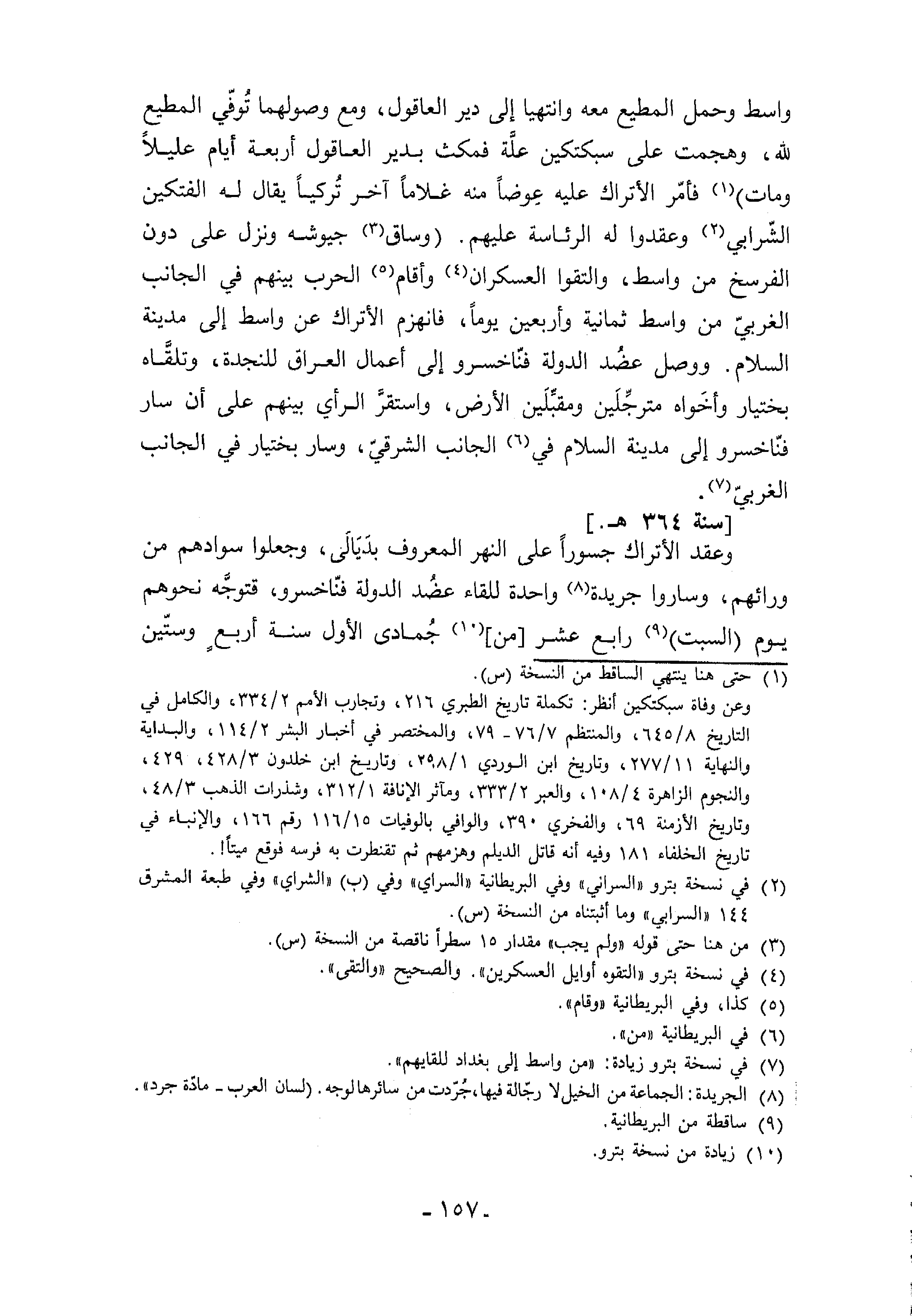 وعقد الأتراك جسورا على النهر المعروف بديالى، وجعلوا سوادهم من ورائهم، وساروا جريدة (¬8) واحدة للقاء عضد الدولة فنّاخسرو، قتوجّه نحوهم يوم (السبت) (¬9) رابع عشر [من] (¬10) جمادى الأول سنة أربع وستّين
