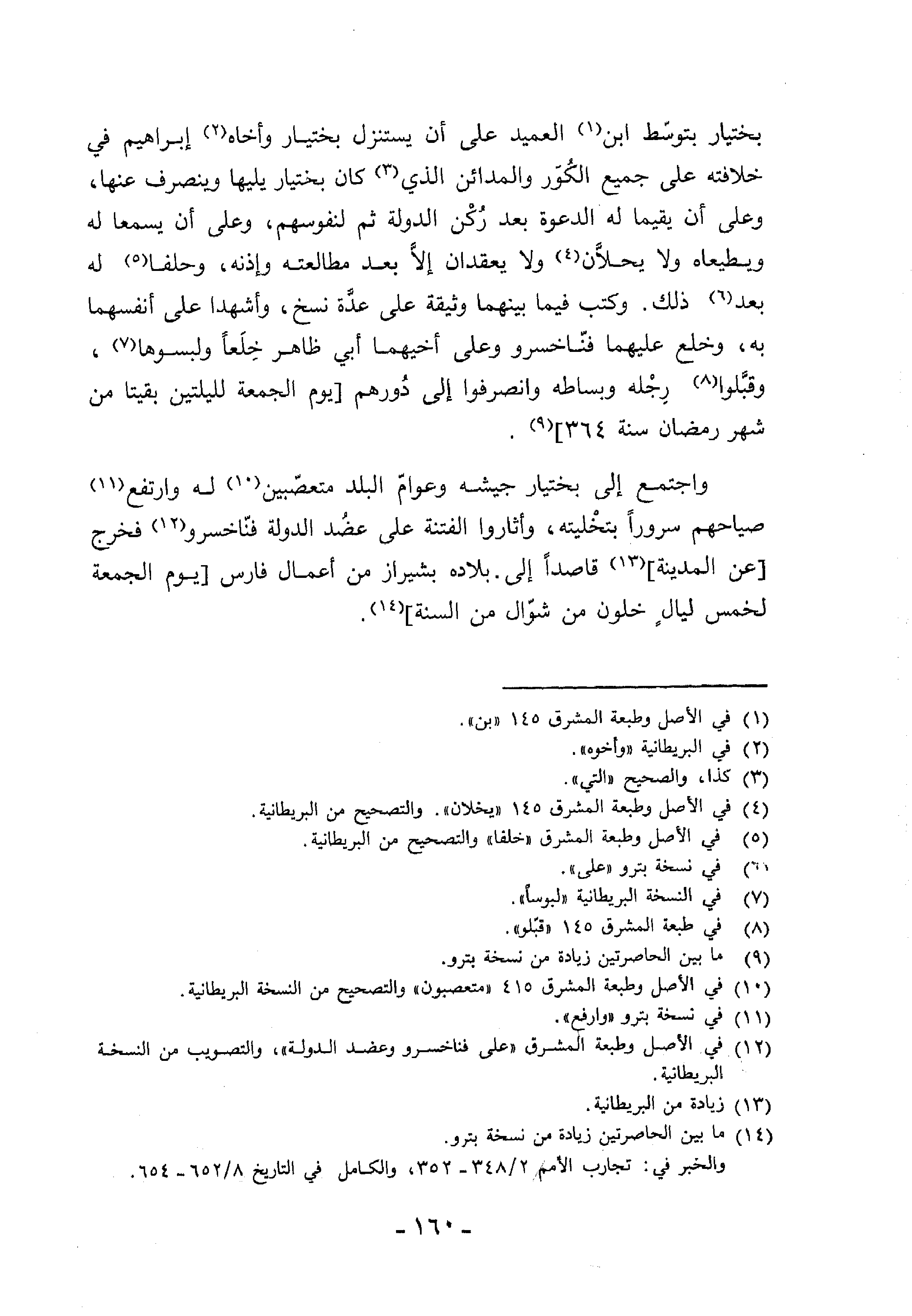 (¬14) ما بين الحاصرتين زيادة من نسخة بترو. والخبر في: تجارب الأمم 2/ 348 - 352، والكامل في التاريخ 8/ 652 - 654.