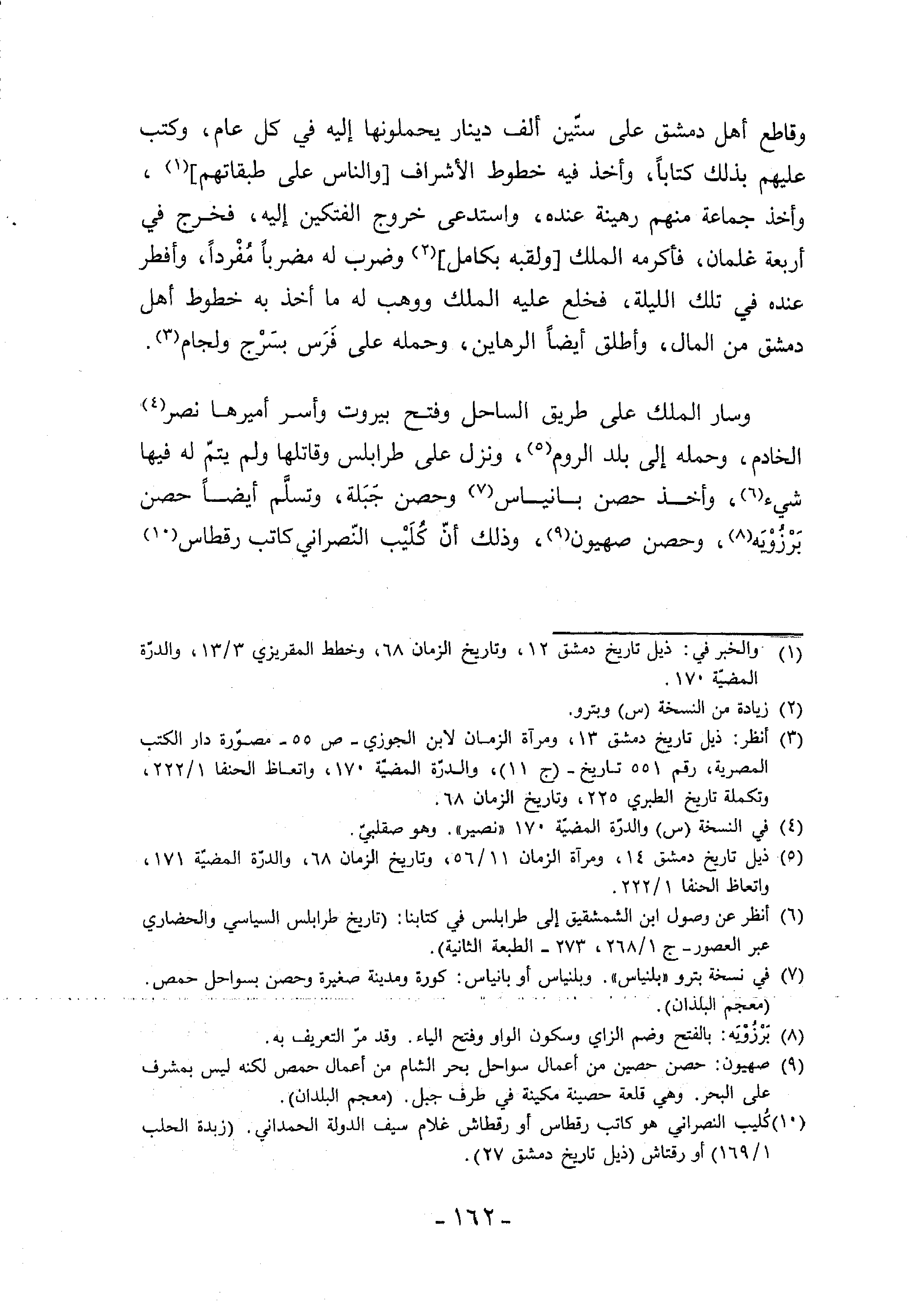 وسار الملك على طريق الساحل وفتح بيروت وأسر أميرها نصر (¬4) الخادم، وحمله إلى بلد الروم (¬5)، ونزل على طرابلس وقاتلها ولم يتمّ له فيها شيء (¬6)، وأخذ حصن بانياس (¬7) وحصن جبلة، وتسلّم أيضا حصن برزويه (¬8)، وحصن صهيون (¬9)، وذلك أنّ كليب النّصراني كاتب رقطاس (¬10)